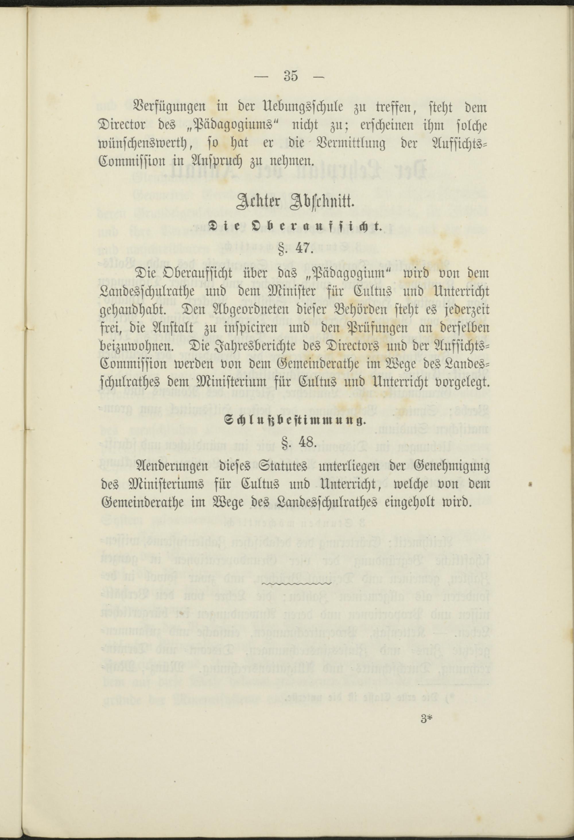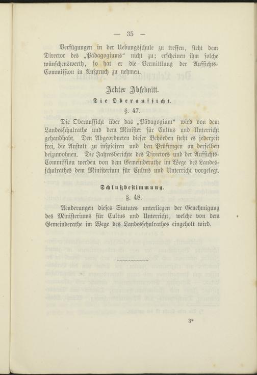 Die Oberaufsicht über das „Pädagogium" wird von demLandesschulrathe und dem Minister für Cultus und Unterrichtgehandhabt. Den Abgeordneten dieser Behörden steht es jederzeitfrei, die Anstalt zu inspiciren und den Prüfungen an derselbenbeizuwohnen. Die Jahresberichte des Directors und der Aufsichts-Commission werden von dem Gemeinderathe im Wege des Landes-schulrathes dem Ministerium für Cultus und Unterricht vorgelegt.