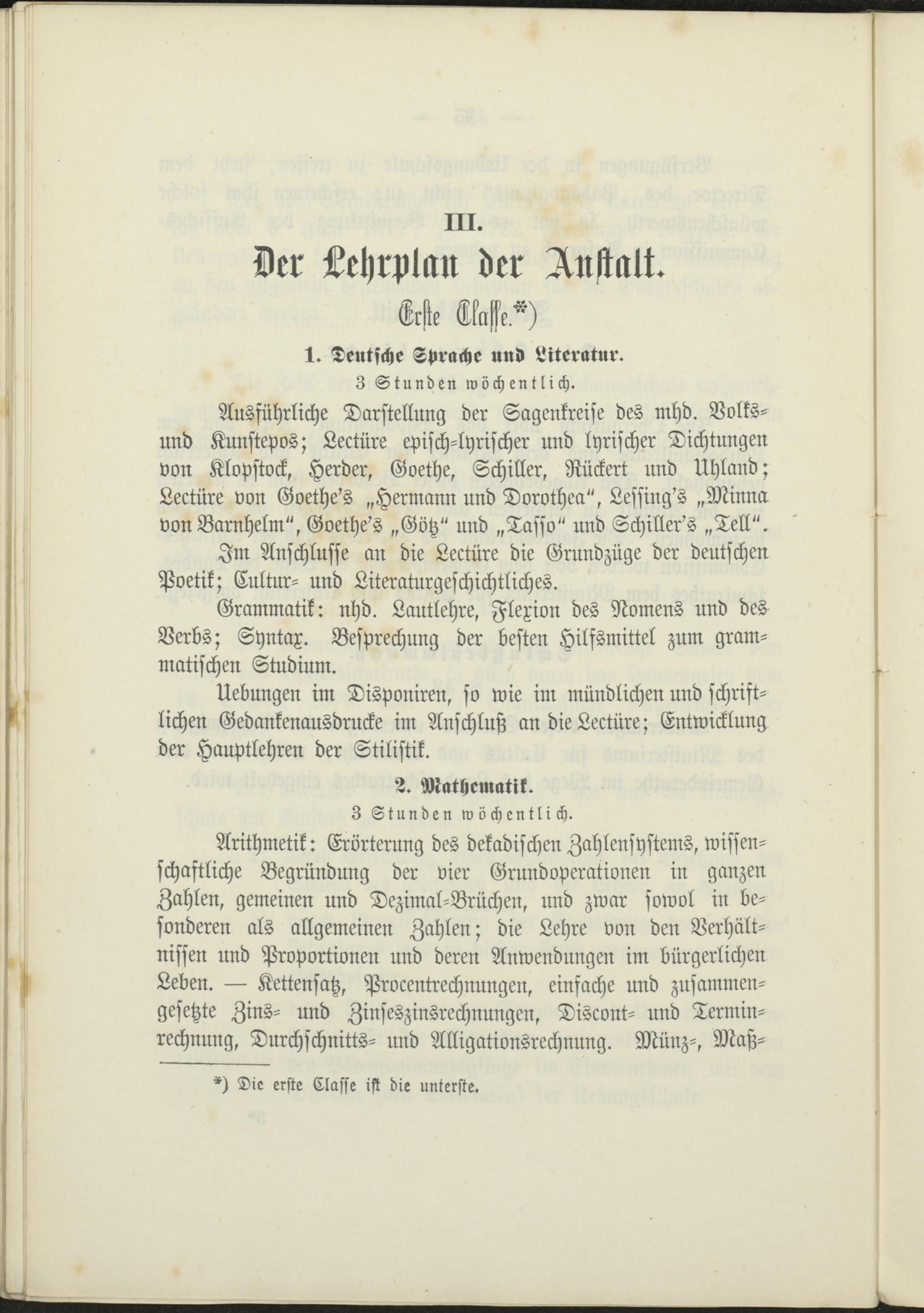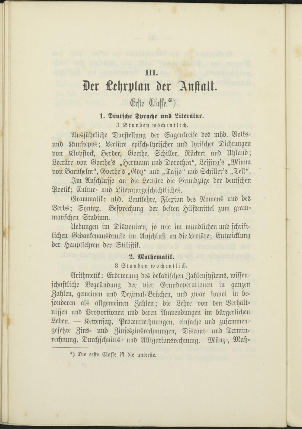 Arithmetik: Erörterung des dekadischen Zahlensystems, wissen-schaftliche Begründung der vier Grundoperationen in ganzenZahlen, gemeinen und Dezimal-Brüchen, und zwar sowol in be-sonderen als allgemeinen Zahlen; die Lehre von den Verhält-nissen und Proportionen und deren Anwendungen im bürgerlichenLeben. — Kettensatz, Procentrechnungen, einfache und zusammen-gesetzte Zins- und Zinseszinsrechnungen, Discont- und Termin-rechnung, Durchschnitts- und Alligationsrechnung. Münz-, Maß-