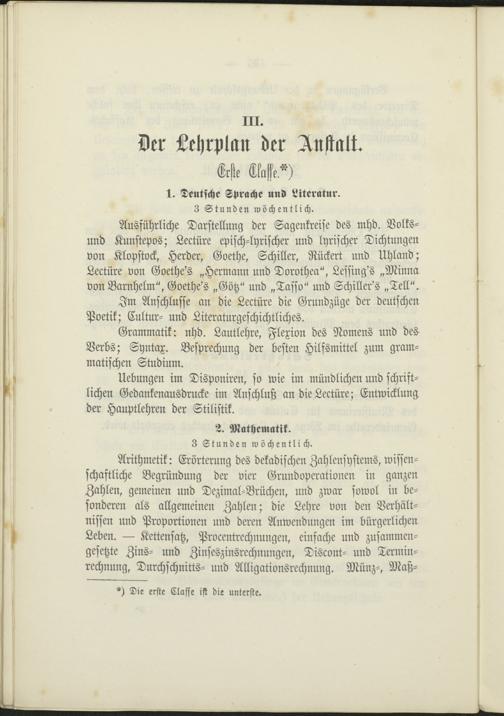 Ausführliche Darstellung der Sagenkreise des mhd. Volks-und Kunstepos; Lectüre episch-lyrischer und lyrischer Dichtungenvon Klopstock, Herder, Goethe, Schiller, Rückert und Uhland;Lectüre von Goethe's „Hermann und Dorothea", Lessing's „Minnavon Barnhelm", Goethe's „Götz" und „Tasso" und Schiller's „Dell".