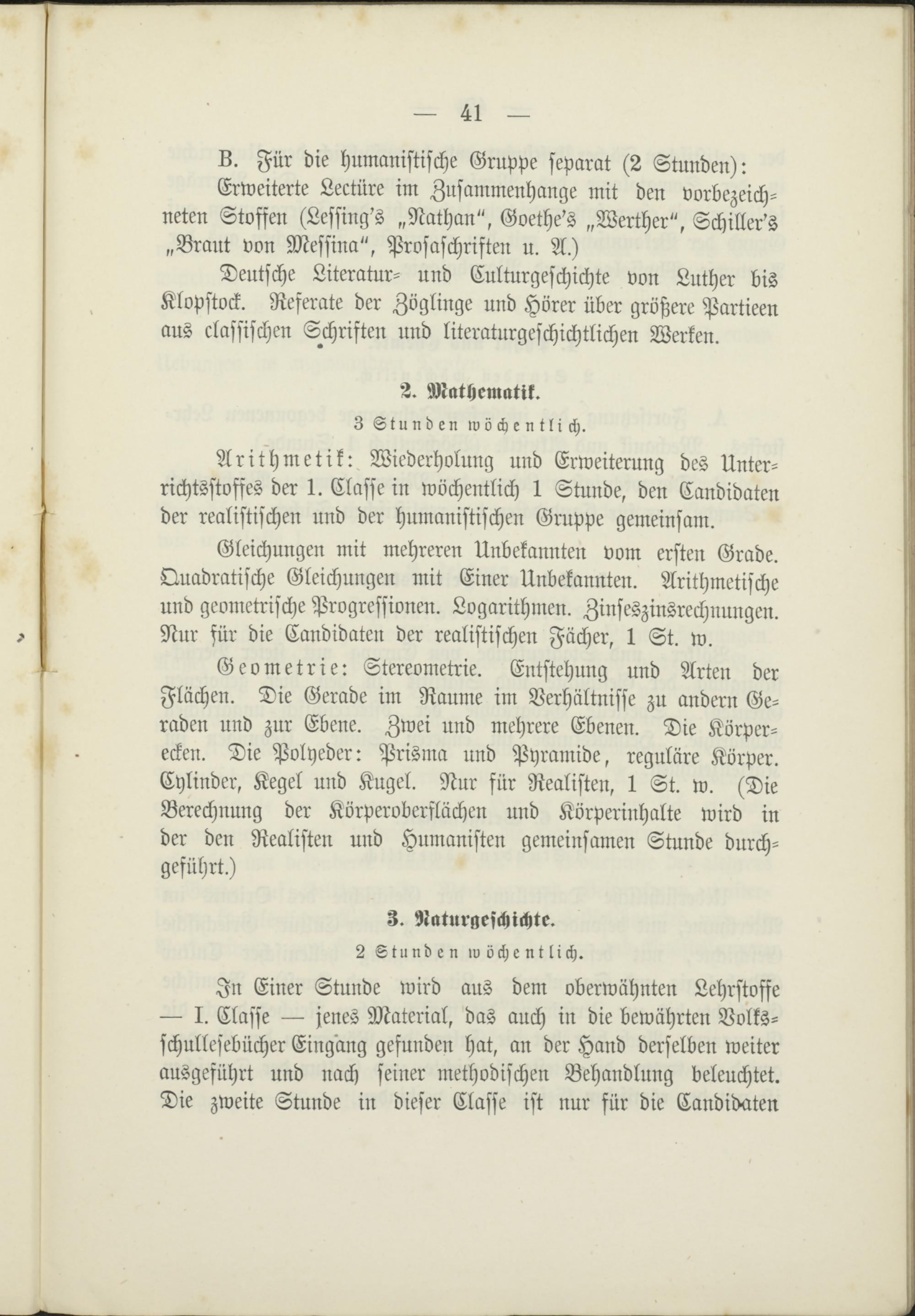 Geometrie: Stereometrie. Entstehung und Arten derFlächen. Die Gerade im Raume im Verhältnisse zu andern Ge-raden und zur Ebene. Zwei und mehrere Ebenen. Die Körper-ecken. Die Polyeder: Prisma und Pyramide, reguläre Körper.Cylinder, Kegel und Kugel. Nur für Realisten, 1 St. w. (DieBerechnung der Körperoberflächen und Körperinhalte wird inder den Realisten und Humanisten gemeinsamen Stunde durch-geführt.)