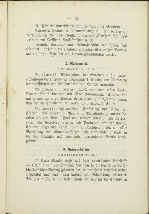 Arithmetik: Wiederholung und Erweiterung des Unter-richtsstoffes der 1. Classe in wöchentlich 1 Stunde, den Candidatender realistischen und der humanistischen Gruppe gemeinsam.