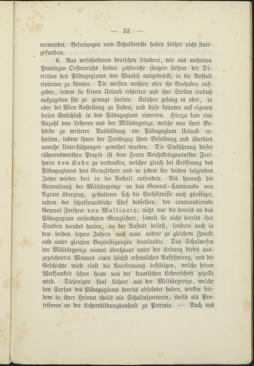 6. Aus verschiedenen deutschen Ländern, wie aus mehrerenProvinzen Oesterreichs haben zahlreiche jüngere Lehrer der Di-rektion des Pädagogiums den Wunsch ausgedrückt, in die Anstalteintreten zu können. Die meisten mußten aber ihr Vorhaben auf-geben, indem sie keinen Urlaub erhielten und ihre Stellen einfachaufzugeben für zu gewagt hielten. Etlichen gelang es aber, inoder bei Wien Anstellung zu finden, und diese konnten auf eigenenfreien Entschluß in das Pädagogium eintreten. Hierzu kam eineAnzahl von Lehrern aus der Militärgrenze, welche von ihrer Be-hörde zu weiterer Ausbildung am Pädagogium Urlaub er-hielten, indem ihnen der Fortbezug ihrer Besoldung und überdiesmanche Unterstützungen gewährt wurden. Die Einführung dieserrühmenswerthen Praxis ist dem Herrn Reichskriegsminister Frei-herrn von Kühn zu verdanken, welcher gleich bei Eröffnung desPädagogiums drei Grenzlehrer und in jedem der beiden folgendenJahre wieder drei in die Anstalt entsendete. Als hernach dieVerwaltung der Militärgrenze an das General - Commando vonAgram überging, gestalteten sich die Verhältnisse noch günstiger,indem der schulfreundliche Chef desselben, der commandirendeGeneral Freiherr von Mollinary, nicht nur die bereits an dasPädagogium entsendeten Grenzlehrer, soweit sie nicht bereits ihreStudien beendet hatten, an der Anstalt beließ, sondern auch inden beiden letzten Jahren noch neun andere zu gleichem Zweckeund unter gleichen Begünstigungen beurlaubte. Das Schulwesender Militärgrenze nimmt überhaupt unter der Leitung dieses aus-gezeichneten Mannes einen höchst erfreulichen Aufschwung, und dieGeschichte wird einst die Anerkennung bestätigen, welche seinerWirksamkeit schon heute von der kroatischen Lehrerschaft gezolltwird. Diejenigen fünf Lehrer aus der Militärgrenze, welcheden Cursus des Pädagogiums bereits absolvirt haben, wirken seit-dem in ihrer Heimat theils als Schulinspectoren, theils als Pro-fessoren an der Lehrerbildungsanstalt zu Petrinia. — Auch aus