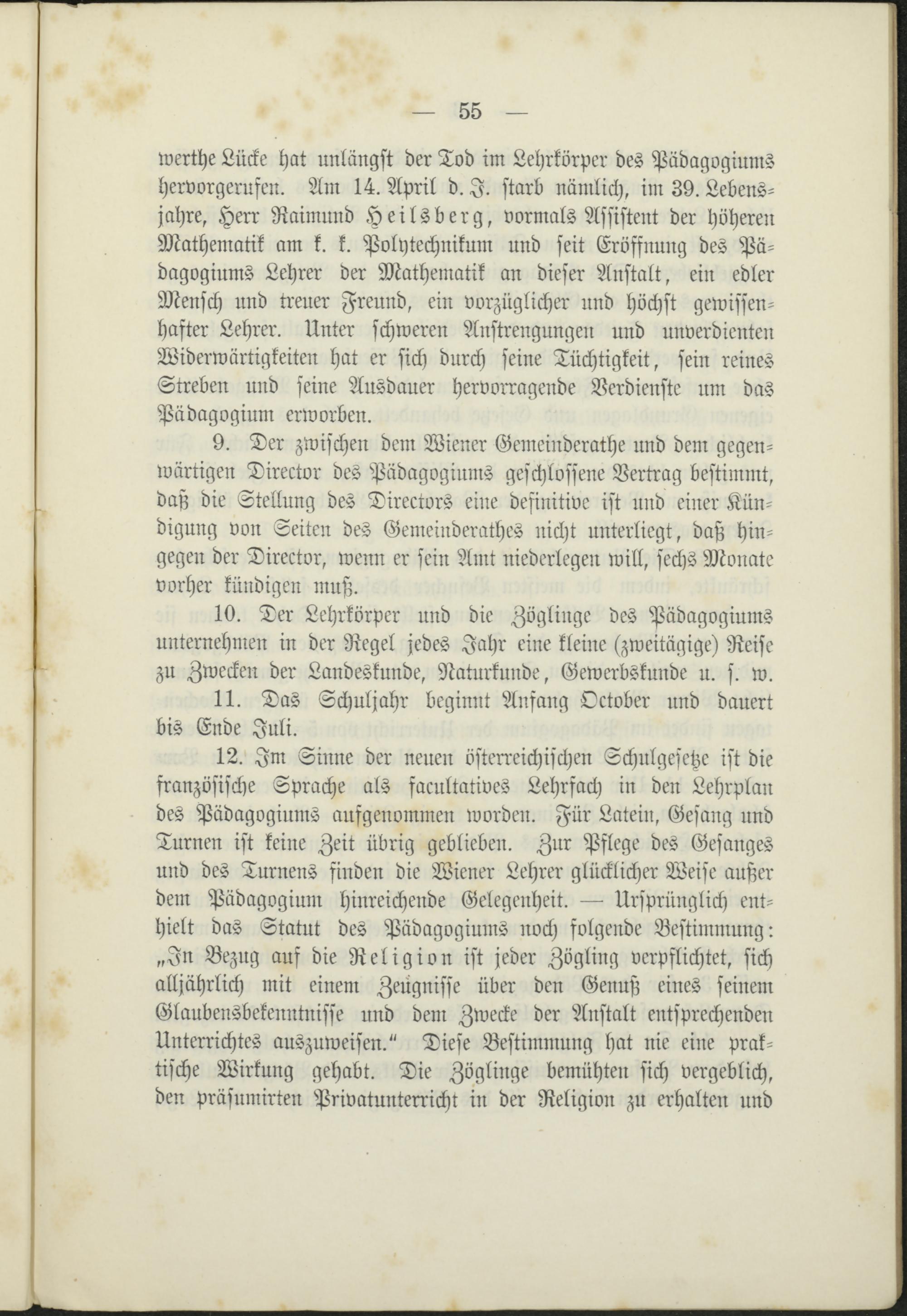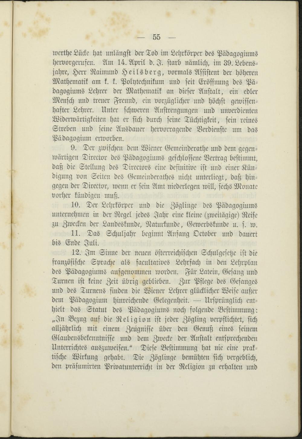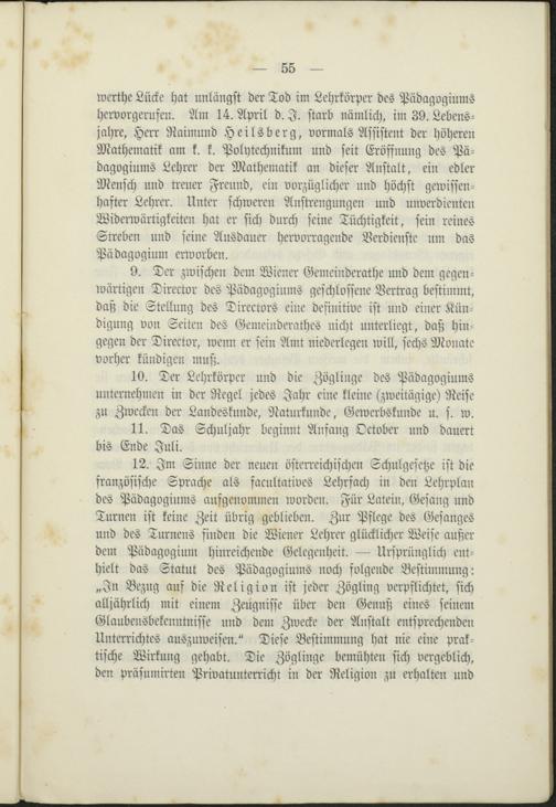 werthe Lücke hat unlängst der Tod im Lehrkörper des Pädagogiumshervorgerufen. Am 14. April d. I. starb nämlich, im 39. Lebens-jahre, Herr Raimund Heilsberg, vormals Assistent der höherenMathematik am k. k. Polytechnikum und seit Eröffnung des Pä-dagogiums Lehrer der Mathematik an dieser Anstalt, ein edlerMensch und treuer Freund, ein vorzüglicher und höchst gewissen-hafter Lehrer. Unter schweren Anstrengungen und unverdientenWiderwärtigkeiten hat er sich durch seine Tüchtigkeit, sein reinesStreben und seine Ausdauer hervorragende Verdienste um dasPädagogium erworben.