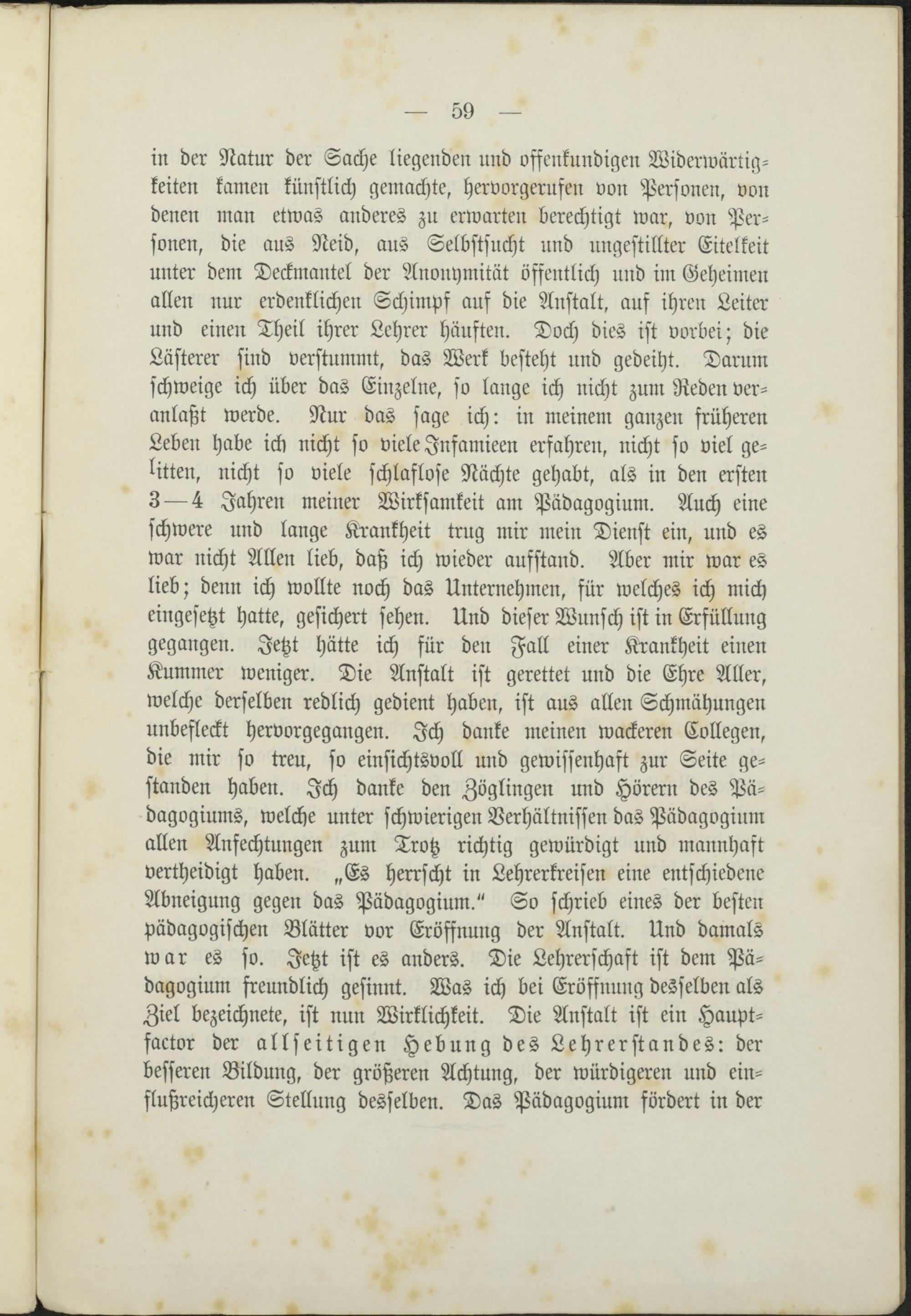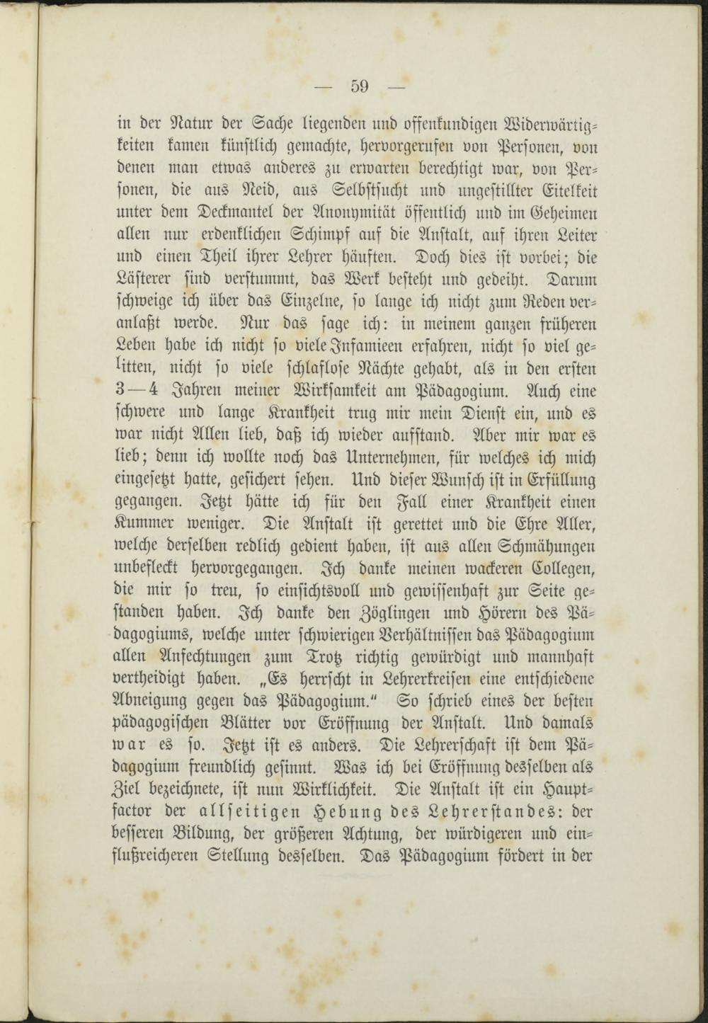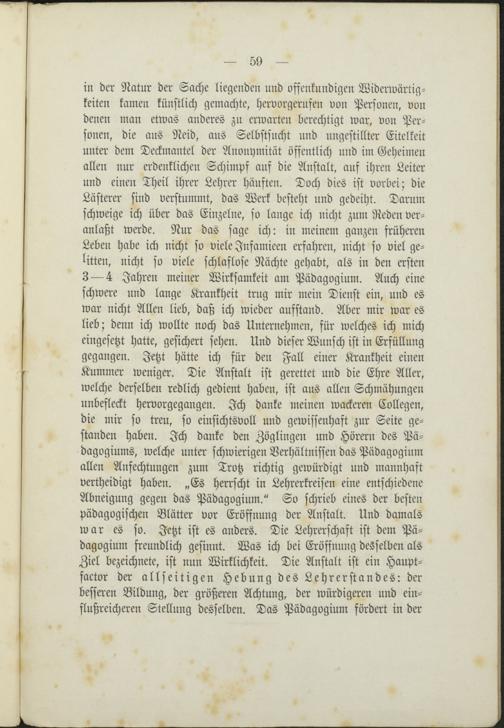 schwere und lange Krankheit trug mir mein Dienst ein, und eswar nicht Allen lieb, daß ich wieder aufstand. Aber mir war eslieb; denn ich wollte noch das Unternehmen, für welches ich micheingesetzt hatte, gesichert sehen. Und dieser Wunsch ist in Erfüllunggegangen. Jetzt hätte ich für den Fall einer Krankheit einenKummer weniger. Die Anstalt ist gerettet und die Ehre Aller,welche derselben redlich gedient haben, ist aus allen Schmähungenunbefleckt hervorgegangen. Ich danke meinen wackeren Collegen,die mir so treu, so einsichtsvoll und gewissenhaft zur Seite ge-standen haben. Ich danke den Zöglingen und Hörern des Pä-dagogiums, welche unter schwierigen Verhältnissen das Pädagogiumallen Anfechtungen zum Trotz richtig gewürdigt und mannhaftvertheidigt haben. „Es herrscht in Lehrerkreisen eine entschiedeneAbneigung gegen das Pädagogium." So schrieb eines der bestenpädagogischen Blätter vor Eröffnung der Anstalt. Und damalswar es so. Jetzt ist es anders. Die Lehrerschaft ist dem Pä-dagogium freundlich gesinnt. Was ich bei Eröffnung desselben alsZiel bezeichnete, ist nun Wirklichkeit. Die Anstalt ist ein Haupt-factor der allseitigen Hebung des Lehrerstandes: derbesseren Bildung, der größeren Achtung, der würdigeren und ein-flußreicheren Stellung desselben. Das Pädagogium fördert in der