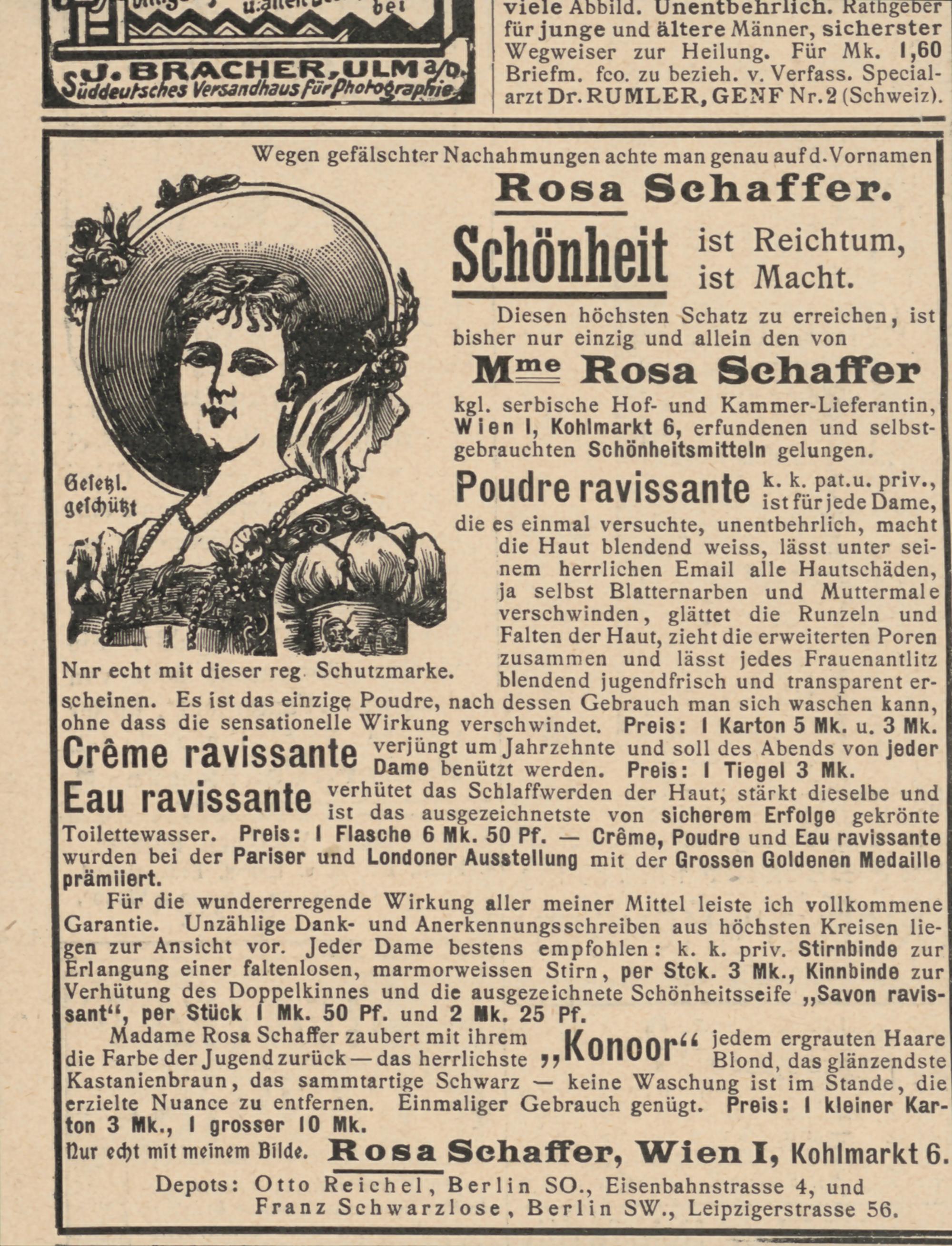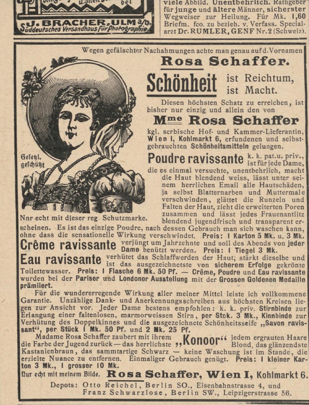 Für die wundererregende Wirkung aller meiner Mittel leiste ich vollkommeneGarantie. Unzählige Dank- und Anerkennungsschreiben aus höchsten Kreisen liegen zur Ansicht vor. Jeder Dame bestens empfohlen: k. k. priv. Stirnbinde zurErlangung einer faltenlosen, marmorweissen Stirn, per Stck. 3 Mk., Kinnbinde zurVerhütung des Doppelkinnes und die ausgezeichnete Schönheitsseife ,, Savon ravis-sant“, per Stück ( Mk. 50 Pf. und 2 Mk. 25 Pf.