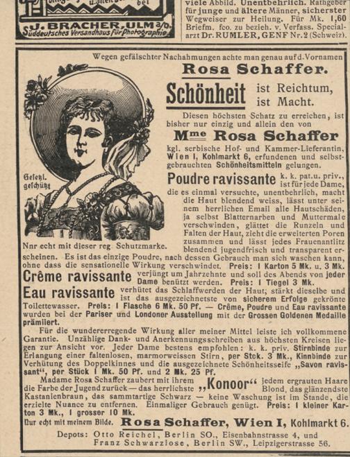 kgl. serbische Hof- und Kammer-Lieferantin,Wien I, Kohlmarkt 6, erfundenen und selbst-gebrauchten Schönheitsmitteln gelungen.