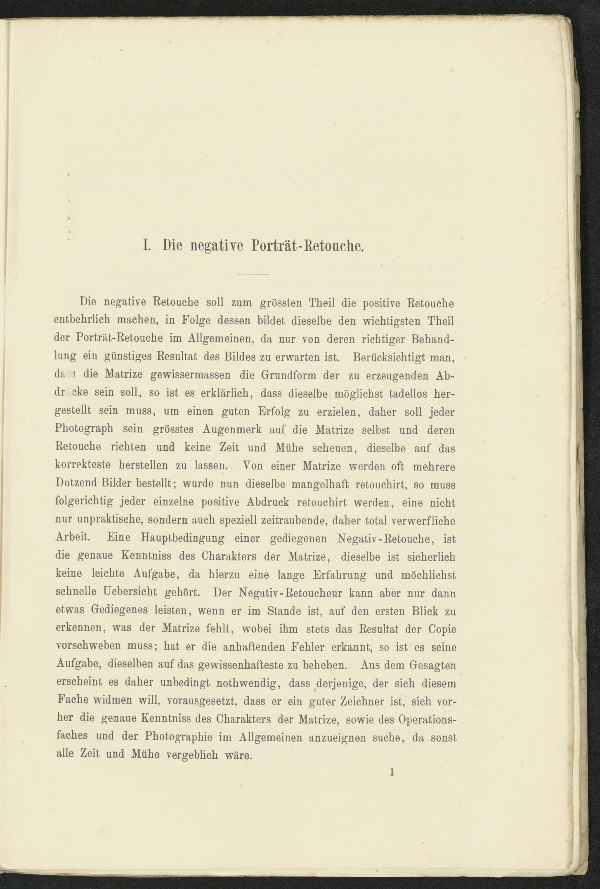 Die negative Retouche soll zum grössten Theil die positive Retoucheentbehrlich machen, in Folge dessen bildet dieselbe den wichtigsten Theilder Porträt-Retouche im Allgemeinen, da nur von deren richtiger Behand-lung ein günstiges Resultat des Bildes zu erwarten ist. Berücksichtigt man,da 3 die Matrize gewissermassen die Grundform der zu erzeugenden Ab-drucke sein soll, so ist es erklärlich, dass dieselbe möglichst tadellos her-gestellt sein muss, um einen guten Erfolg zu erzielen, daher soll jederPhotograph sein grösstes Augenmerk auf die Matrize selbst und derenRetouche richten und keine Zeit und Mühe scheuen, dieselbe auf daskorrekteste hersteilen zu lassen. Von einer Matrize werden oft mehrereDutzend Bilder bestellt; wurde nun dieselbe mangelhaft retouchirt, so mussfolgerichtig jeder einzelne positive Abdruck retouchirt werden, eine nichtnur unpraktische, sondern auch speziell zeitraubende, daher total verwerflicheArbeit. Eine Hauptbedingung einer gediegenen Negativ-Retouche, istdie genaue Kenntniss des Charakters der Matrize, dieselbe ist sicherlichkeine leichte Aufgabe, da hierzu eine lange Erfahrung und möchlichstschnelle Uebersicht gehört. Der Negativ-Retoucheur kann aber nur dannetwas Gediegenes leisten, wenn er im Stande ist, auf den ersten Blick zuerkennen, was der Matrize fehlt, wobei ihm stets das Resultat der Copievorschweben muss; hat er die anhaftenden Fehler erkannt, so ist es seineAufgabe, dieselben auf das gewissenhafteste zu beheben. Aus dem Gesagtenerscheint es daher unbedingt nothwendig, dass derjenige, der sich diesemFache widmen will, vorausgesetzt, dass er ein guter Zeichner ist, sich vor-her die genaue Kenntniss des Charakters der Matrize, sowie des Operations-faches und der Photographie im Allgemeinen anzueignen suche, da sonstalle Zeit und Mühe vergeblich wäre.