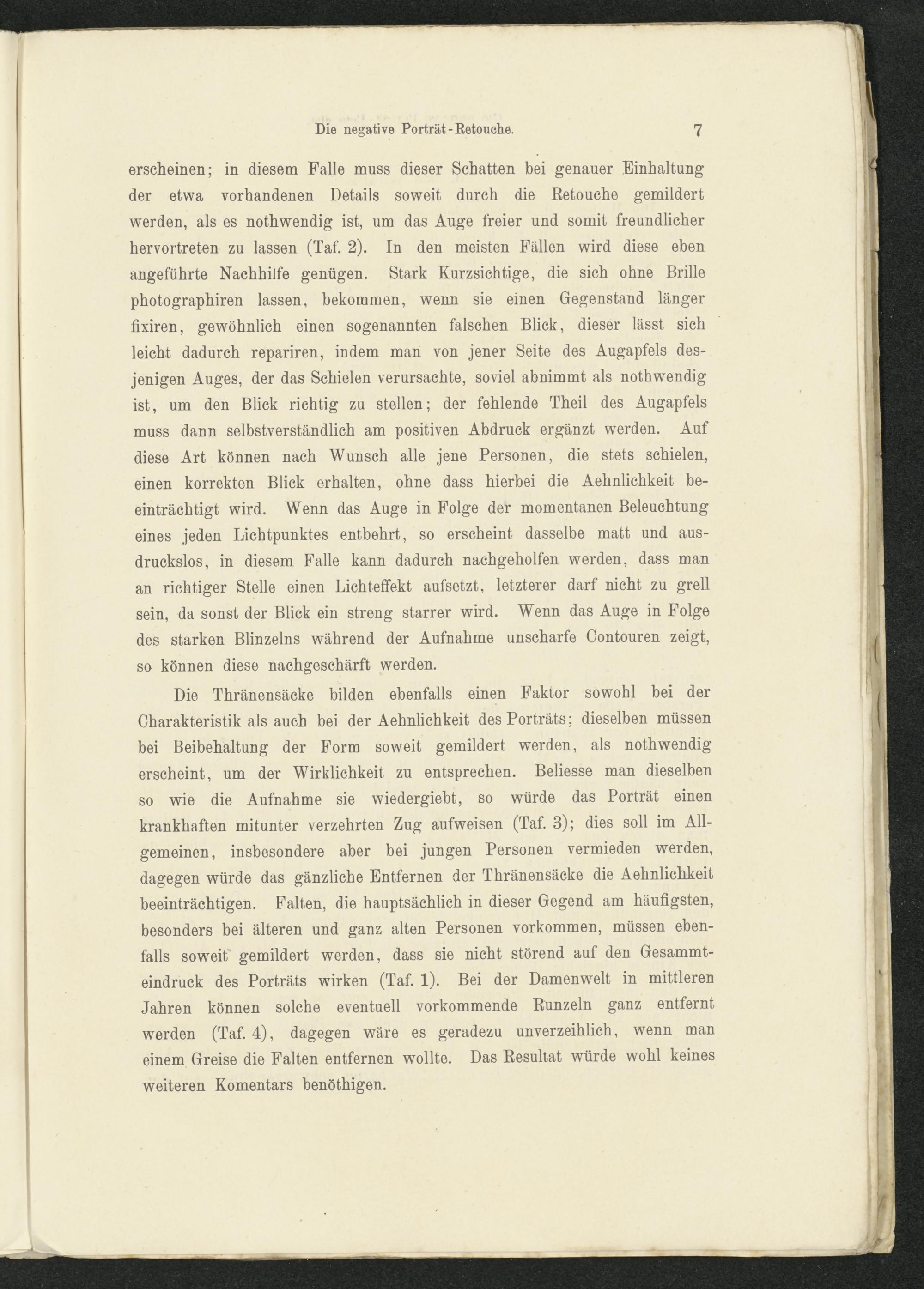 erscheinen; in diesem Falle muss dieser Schatten bei genauer Einhaltungder etwa vorhandenen Details soweit durch die Retouche gemildertwerden, als es nothwendig ist, um das Auge freier und somit freundlicherhervortreten zu lassen (Taf. 2). In den meisten Fällen wird diese ebenangeführte Nachhilfe genügen. Stark Kurzsichtige, die sich ohne Brillephotographiren lassen, bekommen, wenn sie einen Gegenstand längerfixiren, gewöhnlich einen sogenannten falschen Blick, dieser lässt sichleicht dadurch repariren, indem man von jener Seite des Augapfels des-jenigen Auges, der das Schielen verursachte, soviel abnimmt als nothwendigist, um den Blick richtig zu stellen; der fehlende Theil des Augapfelsmuss dann selbstverständlich am positiven Abdruck ergänzt werden. Aufdiese Art können nach Wunsch alle jene Personen, die stets schielen,einen korrekten Blick erhalten, ohne dass hierbei die Aehnlichkeit be-einträchtigt wird. Wenn das Auge in Folge der momentanen Beleuchtungeines jeden Lichtpunktes entbehrt, so erscheint dasselbe matt und aus-druckslos, in diesem Falle kann dadurch nachgeholfen werden, dass manan richtiger Stelle einen Lichteffekt aufsetzt, letzterer darf nicht zu grellsein, da sonst der Blick ein streng starrer wird. Wenn das Auge in Folgedes starken Blinzelns während der Aufnahme unscharfe Contouren zeigt,so können diese nachgeschärft werden.
