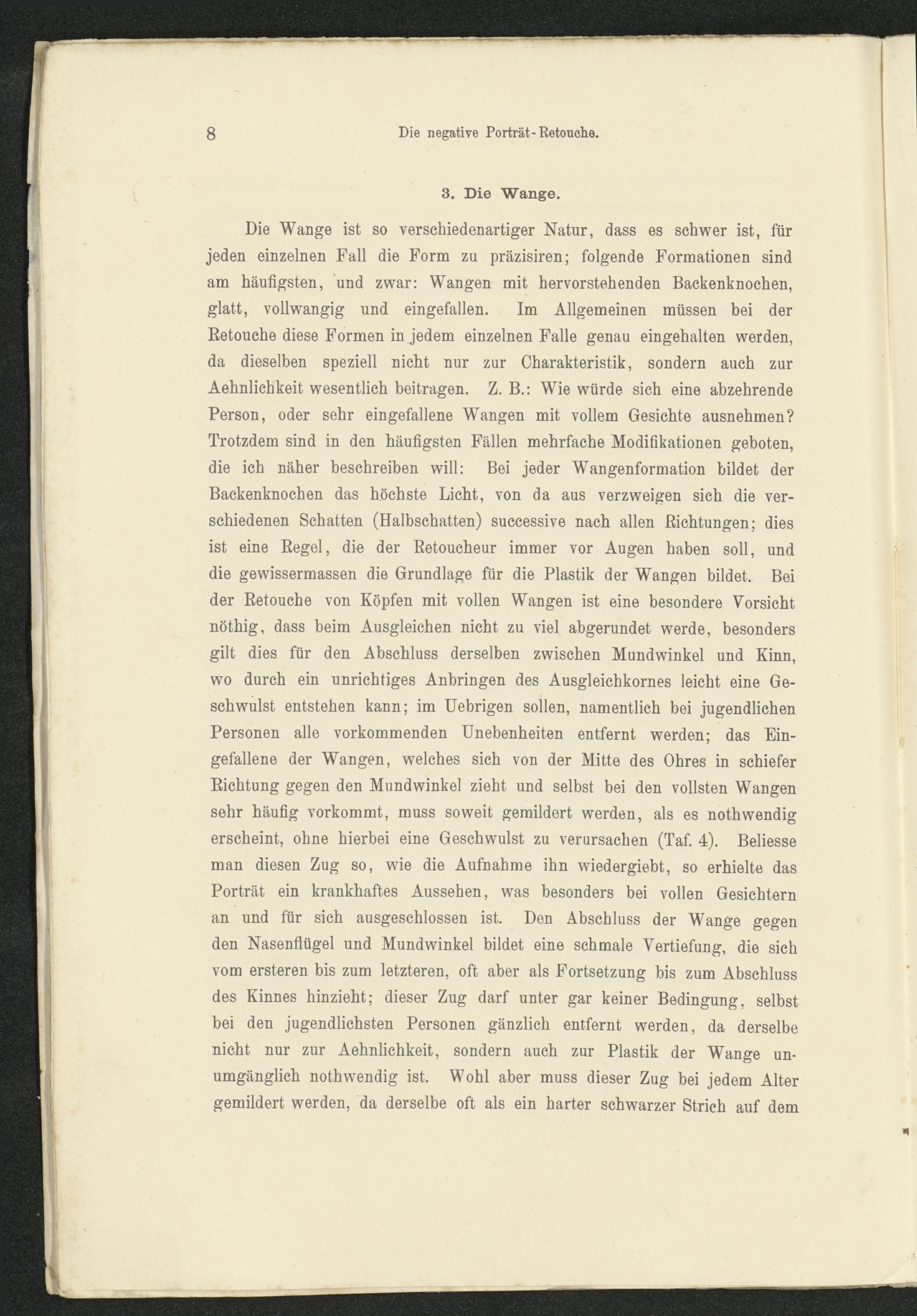 Die Wange ist so verschiedenartiger Natur, dass es schwer ist, fürjeden einzelnen Fall die Form zu präzisiren; folgende Formationen sindam häufigsten, und zwar: Wangen mit hervorstehenden Backenknochen,glatt, vollwangig und eingefallen. Im Allgemeinen müssen bei derßetouche diese Formen in jedem einzelnen Falle genau eingehalten werden,da dieselben speziell nicht nur zur Charakteristik, sondern auch zurAehnlichkeit wesentlich beitragen. Z. B.: Wie würde sich eine abzehrendePerson, oder sehr eingefallene Wangen mit vollem Gesichte ausnehmen?Trotzdem sind in den häufigsten Fällen mehrfache Modifikationen geboten,die ich näher beschreiben will: Bei jeder Wangenformation bildet derBackenknochen das höchste Licht, von da aus verzweigen sich die ver-schiedenen Schatten (Halbschatten) successive nach allen Richtungen; diesist eine Regel, die der Retoucheur immer vor Augen haben soll, unddie gewissermassen die Grundlage für die Plastik der Wangen bildet. Beider Retouche von Köpfen mit vollen Wangen ist eine besondere Vorsichtnöthig, dass beim Ausgleichen nicht zu viel abgerundet werde, besondersgilt dies für den Abschluss derselben zwischen Mundwinkel und Kinn,wo durch ein unrichtiges Anbringen des Ausgleichkornes leicht eine Ge-schwulst entstehen kann; im Uebrigen sollen, namentlich bei jugendlichenPersonen alle vorkommenden Unebenheiten entfernt werden; das Ein-gefallene der Wangen, welches sich von der Mitte des Ohres in schieferRichtung gegen den Mundwinkel zieht und selbst bei den vollsten Wangensehr häufig vorkommt, muss soweit gemildert werden, als es nothwendigerscheint, ohne hierbei eine Geschwulst zu verursachen (Taf. 4). Beliesseman diesen Zug so, wie die Aufnahme ihn wiedergiebt, so erhielte dasPorträt ein krankhaftes Aussehen, was besonders bei vollen Gesichternan und für sich ausgeschlossen ist. Den Abschluss der Wange gegenden Nasenflügel und Mundwinkel bildet eine schmale Vertiefung, die sichvom ersteren bis zum letzteren, oft aber als Fortsetzung bis zum Abschlussdes Kinnes hinzieht; dieser Zug darf unter gar keiner Bedingung, selbstbei den jugendlichsten Personen gänzlich entfernt werden, da derselbenicht nur zur Aehnlichkeit, sondern auch zur Plastik der Wange un-umgänglich nothwendig ist. Wohl aber muss dieser Zug bei jedem Altergemildert werden, da derselbe oft als ein harter schwarzer Strich auf dem