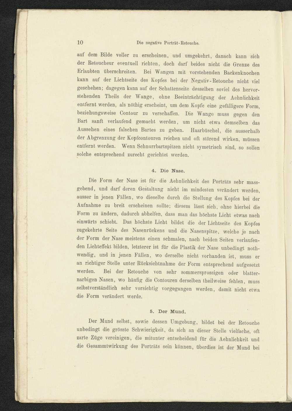 Die Form der Nase ist für die Aehnlichkeit des Porträts sehr mass-gebend, und darf deren Gestaltung nicht im mindesten verändert werden,ausser in jenen Fällen, wo dieselbe durch die Stellung des Kopfes bei derAufnahme zu breit erscheinen sollte; diesem lässt sich, ohne hierbei dieForm zu ändern, dadurch abhelfen, dass man das höchste Licht etwas nacheinwärts schiebt. Das höchste Licht bildet die der Lichtseite des Kopfeszugekehrte Seite des Nasenrückens und die Nasenspitze, welche je nachder Form der Nase meistens einen schmalen, nach beiden Seiten verlaufen-den Lichteffekt bilden, letzterer ist für die Plastik der Nase unbedingt noth-wendig, und in jenen Fällen, wo derselbe nicht vorhanden ist, muss eran richtiger Stelle unter Rücksichtnahme der Form entsprechend aufgesetztwerden. Bei der Retouche von sehr sommersprossigen oder blatter-narbigen Nasen, wo häufig die Gontouren derselben theilweise fehlen, mussselbstverständlich sehr vorsichtig vorgegangen werden, damit nicht etwadie Form verändert werde.