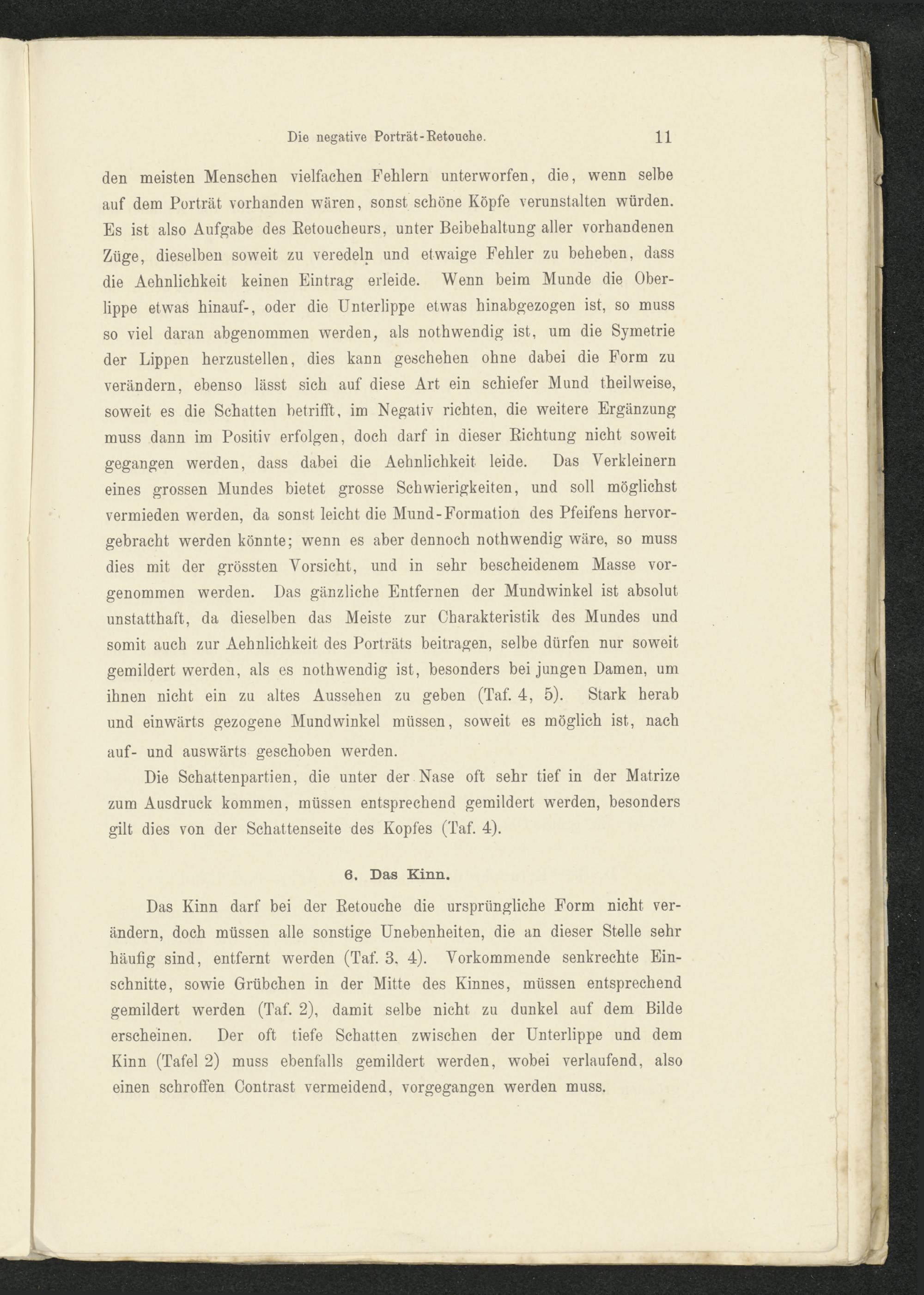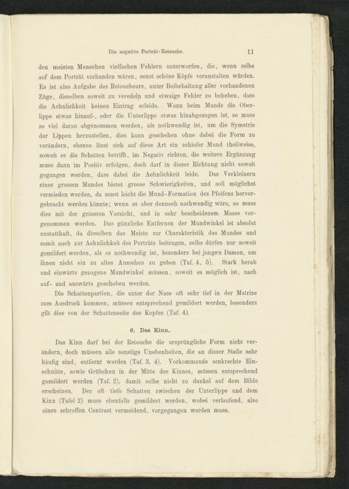 Das Kinn darf bei der Retouche die ursprüngliche Form nicht ver-ändern, doch müssen alle sonstige Unebenheiten, die an dieser Stelle sehrhäufig sind, entfernt werden (Taf. 3. 4). Vorkommende senkrechte Ein-schnitte, sowie Grübchen in der Mitte des Kinnes, müssen entsprechendgemildert werden (Taf. 2), damit selbe nicht zu dunkel auf dem Bildeerscheinen. Der oft tiefe Schatten zwischen der Unterlippe und demKinn (Tafel 2) muss ebenfalls gemildert werden, wobei verlaufend, alsoeinen schroffen Contrast vermeidend, vorgegangen werden muss.