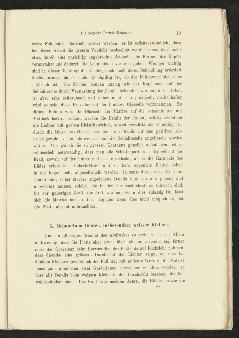 weise Fehlendes künstlich ersetzt werden; es ist selbstverständlich, dassbei dieser Arbeit die grösste Vorsicht beobachtet werden muss, dass nichtetwa durch eine unrichtig angebrachte Retouehe die Formen des Kopfesverunstaltet und dadurch die Aehnlichkeit verloren gehe. Weniger wichtigsind in dieser Richtung die Kleider, doch auch deren Behandlung erfordertSachkenntniss, da es nicht gleichgültig ist, ob der Faltenwurf steif odernatürlich ist. Die Kleider können analog wie der Kopf auch auf derSchichteseite durch Verstärkung der Details behandelt werden; diese Arbeitist aber sehr zeitraubend und daher nicht sehr praktisch; vortheilhafterwird es sein, diese Prozedur auf der hinteren Glasseite vorzunehmen. Zudiesem Behufe wird die Glasseite der Matrize auf die bekannte Art mitMattlack lackirt, sodann werden die Details der Falten, selbstverständlichdie Lichter mit groben Bleistiftstrichen, soweit verstärkt als es nöthig ist;durch die Dicke des Glases erscheinen die Details auf dem positiven Ab-druck gerade so fein, als wenn sie auf der Schichteseite angebracht wordenwären. Um jedoch die zu grossen Kontraste gänzlich aufzuheben, ist esschliesslich nothwendig, dass man alle Schattenpartien, entsprechend derKraft, soweit auf der hinteren Glasseite abdeckt, als es die Harmonie desBildes erfordert. Ueberkräftige und zu kurz exponirte Platten sollenin der Regel nicht abgeschwächt werden, da sonst durch diese Procedursämmtliche, selbst stärker angedeutete Details total verloren gehen; undumgekehrt müssen solche, die in der Durchsichtskraft zu schwach sind,bis zur gehörigen Kraft verstärkt werden; wenn dies zulässig ist, lässtsich die Matrize noch retten, dagegen wenn dies nicht möglich ist, istdie Platte absolut unbrauchbar.
