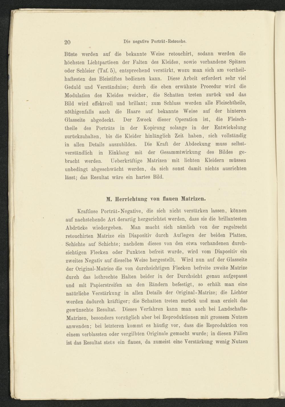 Büste werden auf die bekannte Weise retouchirt, sodann werden diehöchsten Lichtpartieen der Falten des Kleides, sowie vorhandene Spitzenoder Schleier (Taf. 5), entsprechend verstärkt, wozu man sich am vorteil-haftesten des Bleistiftes bedienen kann. Diese Arbeit erfordert sehr vielGeduld und Verständniss; durch die eben erwähnte Procedur wird dieModulation des Kleides weicher, die Schatten treten zurück und dasBild wird effektvoll und brillant; zum Schluss werden alle Fleischtheile,nötigenfalls auch die Haare auf bekannte Weise auf der hinterenGlasseite abgedeckt. Der Zweck dieser Operation ist, die Fleisch -theile des Porträts in der Kopirung solange in der Entwickelungzurückzuhalten, bis die Kleider hinlänglich Zeit haben, sich vollständigin allen Details auszubilden. Die Kraft der Abdeckung muss selbst-verständlich in Einklang mit der Gesammtwirkung des Bildes ge-bracht werden. Ueberkräftige Matrizen mit lichten Kleidern müssenunbedingt abgeschwächt werden, da sich sonst damit nichts ausrichtenlässt; das Resultat wäre ein hartes Bild.