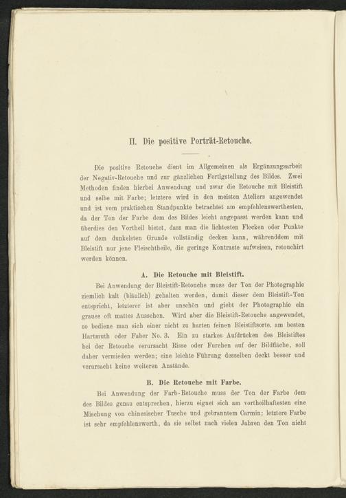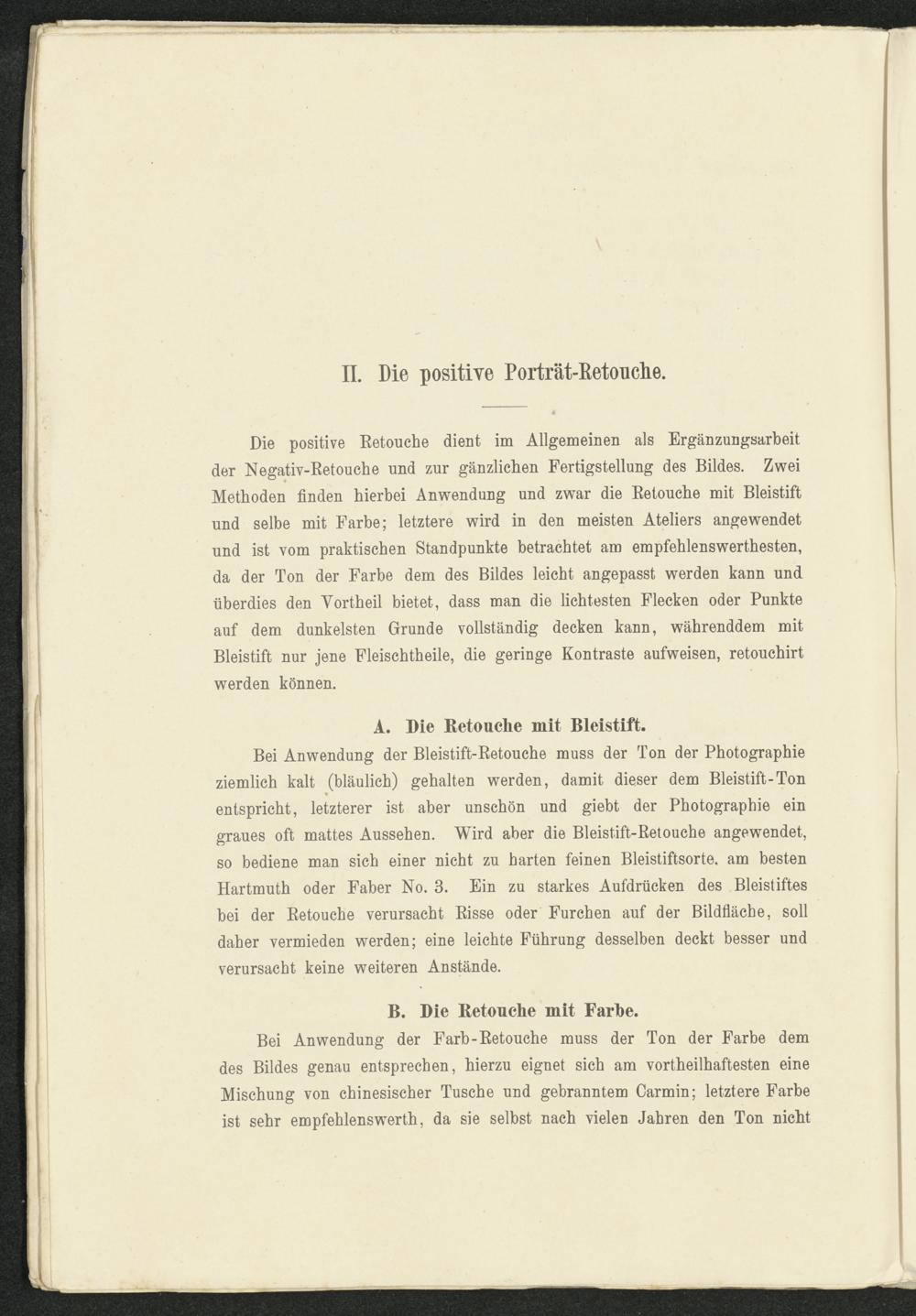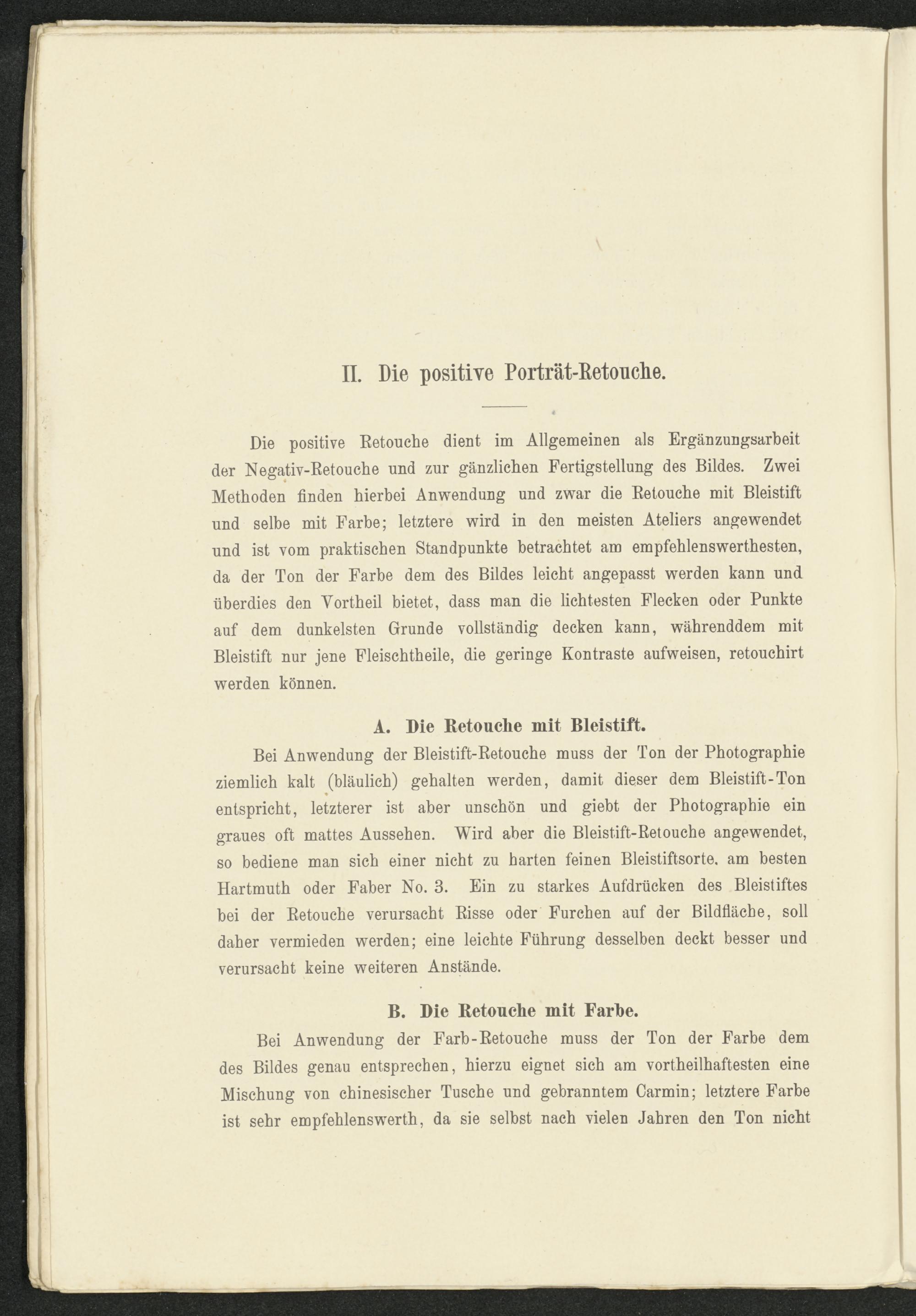 Die positive Retouche dient im Allgemeinen als Ergänzungsarbeitder Negativ-Retouche und zur gänzlichen Fertigstellung des Bildes. ZweiMethoden finden hierbei Anwendung und zwar die Retouche mit Bleistiftund selbe mit Farbe; letztere wird in den meisten Ateliers angewendetund ist vom praktischen Standpunkte betrachtet am empfehlenswerthesten,da der Ton der Farbe dem des Bildes leicht angepasst werden kann undüberdies den Vortheil bietet, dass man die lichtesten Flecken oder Punkteauf dem dunkelsten Grunde vollständig decken kann, währenddem mitBleistift nur jene Fleischtheile, die geringe Kontraste aufweisen, retouchirtwerden können.