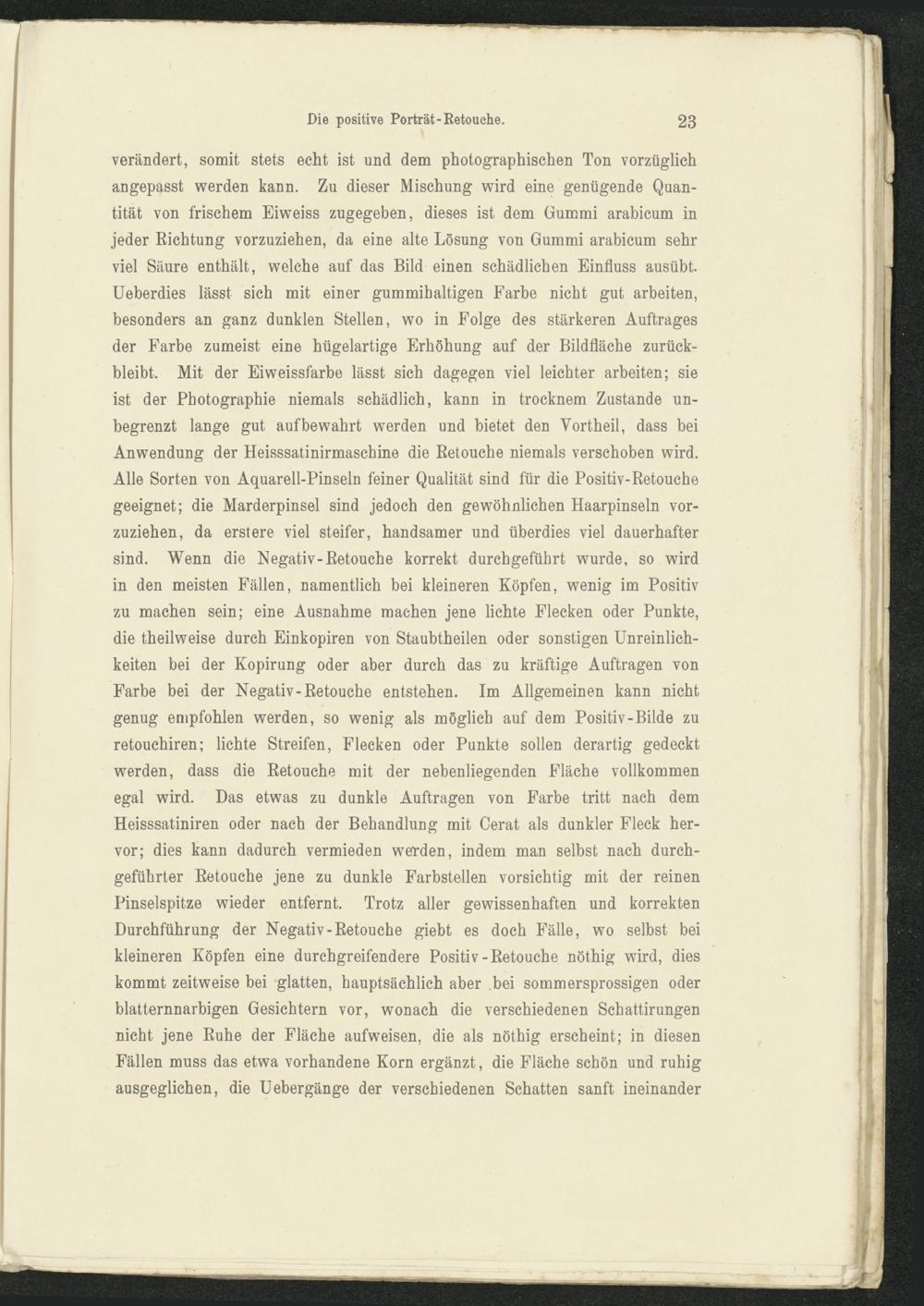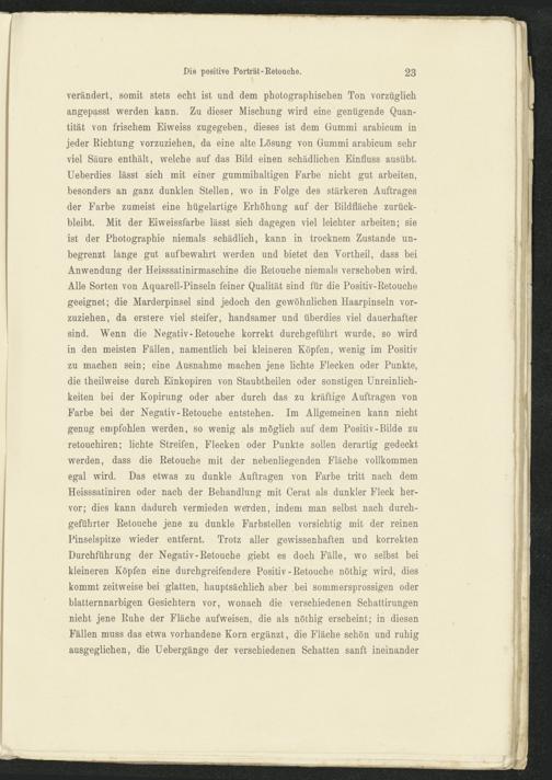 verändert, somit stets echt ist und dem photographischen Ton vorzüglichangepasst werden kann. Zu dieser Mischung wird eine genügende Quan-tität von frischem Eiweiss zugegeben, dieses ist dem Gummi arabicum injeder Eichtung vorzuziehen, da eine alte Lösung von Gummi arabicum sehrviel Säure enthält, welche auf das Bild einen schädlichen Einfluss ausübt.Ueberdies lässt sich mit einer gummihaltigen Farbe nicht gut arbeiten,besonders an ganz dunklen Stellen, wo in Folge des stärkeren Auftragesder Farbe zumeist eine hügelartige Erhöhung auf der Bildfläche zurück-bleibt. Mit der Eiweissfarbe lässt sich dagegen viel leichter arbeiten; sieist der Photographie niemals schädlich, kann in trocknem Zustande un-begrenzt lange gut auf be wahrt werden und bietet den Yortheil, dass beiAnwendung der Heisssatinirmaschine die Eetouche niemals verschoben wird.Alle Sorten von Aquarell-Pinseln feiner Qualität sind für die Positiv-Eetouchegeeignet; die Marderpinsel sind jedoch den gewöhnlichen Haarpinseln vor-zuziehen, da erstere viel steifer, handsamer und überdies viel dauerhaftersind. Wenn die Negativ-Eetouche korrekt durchgeführt wurde, so wirdin den meisten Fällen, namentlich bei kleineren Köpfen, wenig im Positivzu machen sein; eine Ausnahme machen jene lichte Flecken oder Punkte,die theilweise durch Einkopiren von Staubtheilen oder sonstigen Unreinlich-keiten bei der Kopirung oder aber durch das zu kräftige Aufträgen vonFarbe bei der Negativ-Eetouche entstehen. Im Allgemeinen kann nichtgenug empfohlen werden, so wenig als möglich auf dem Positiv-Bilde zuretouchiren; lichte Streifen, Flecken oder Punkte sollen derartig gedecktwerden, dass die Eetouche mit der nebenliegenden Fläche vollkommenegal wird. Das etwas zu dunkle Aufträgen von Farbe tritt nach demHeisssatiniren oder nach der Behandlung mit Cerat als dunkler Fleck her-vor; dies kann dadurch vermieden werden, indem man selbst nach durch-geführter Eetouche jene zu dunkle Farbstellen vorsichtig mit der reinenPinselspitze wieder entfernt. Trotz aller gewissenhaften und korrektenDurchführung der Negativ-Eetouche giebt es doch Fälle, wo selbst beikleineren Köpfen eine durchgreifendere Positiv-Eetouche nöthig wird, dieskommt zeitweise bei glatten, hauptsächlich aber bei sommersprossigen oderblatternnarbigen Gesichtern vor, wonach die verschiedenen Schattirungennicht jene Euhe der Fläche aufweisen, die als nöthig erscheint; in diesenFällen muss das etwa vorhandene Korn ergänzt, die Fläche schön und ruhigausgeglichen, die Uebergänge der verschiedenen Schatten sanft ineinander