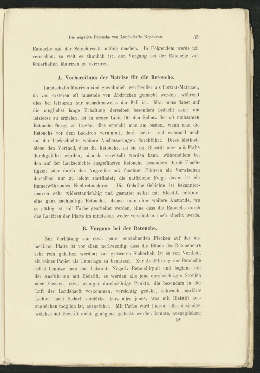 Landschafts-Matrizen sind gewöhnlich werthvoller als Porträt-Matrizen,da von ersteren oft tausende von Abdrücken gemacht werden, währenddies bei letzteren nur ausnahmsweise der Fall ist. Man muss daher aufdie möglichst lange Erhaltung derselben besonders bedacht sein; umletzteres zu erzielen, ist in erster Linie für den Schutz der oft mühsamenRetouche Sorge zu tragen, dies erreicht man am besten, wenn man dieRetouche vor dem Lackiren vornimmt, dann lackirt und eventuell nochauf der Lackschichte weitere Ausbesserungen durchführt. Diese Methodebietet den Vortheil, dass die Retouche, sei sie mit Bleistift oder mit Farbedurchgeführt worden, niemals verwischt werden kann, währenddem heiden auf der Lackschichte ausgeführten Retouche besonders durch Feuch-tigkeit oder durch das Angreifen mit feuchten Fingern ein Verwischenderselben nur zu leicht stattfindet; die natürliche Folge davon ist einimmerwährendes Nacbretouchiren. Die Gelatine-Schichte ist bekannter-massen sehr widerstandsfähig und gestattet selbst mit Bleistift mituntereine ganz nachhaltige Retouche, ebenso kann ohne weitere Anstände, woes nöthig ist, mit Farbe gearbeitet werden, ohne dass die Retouche durchdas Lackiren der Platte im mindesten weder verschoben noch alterirt werde.