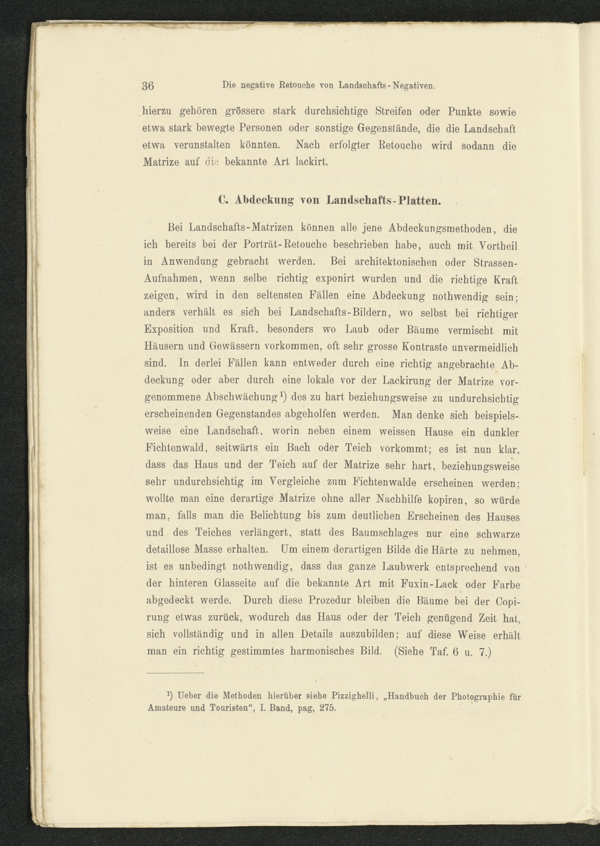 hierzu gehören grössere stark durchsichtige Streifen oder Punkte sowieetwa stark bewegte Personen oder sonstige Gegenstände, die die Landschaftetwa verunstalten könnten. Nach erfolgter ßetouche wird sodann dieMatrize auf die bekannte Art lackirt.
