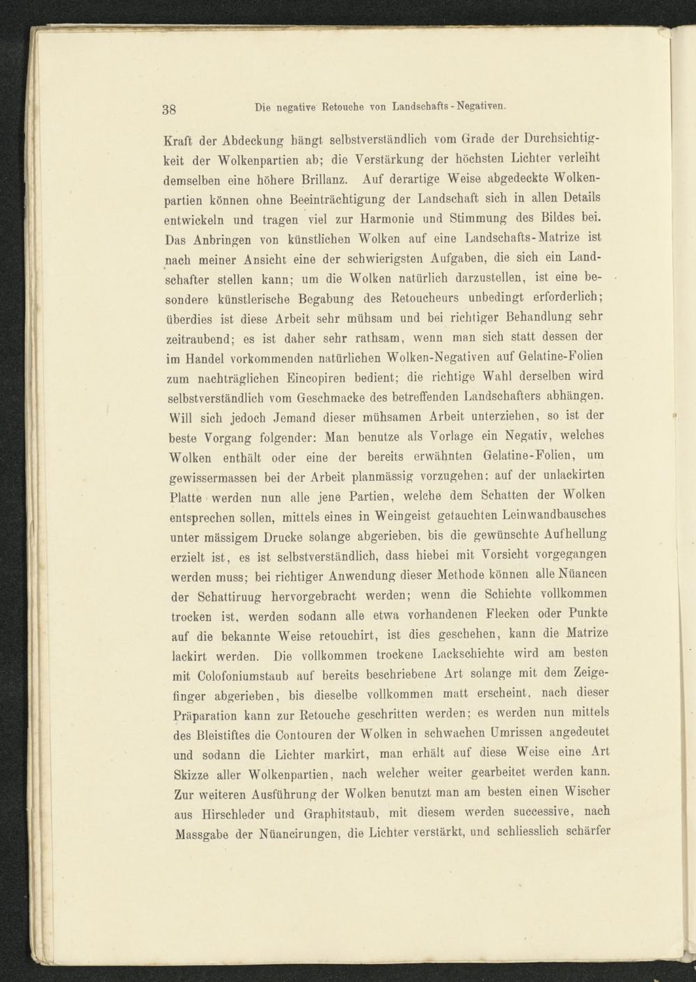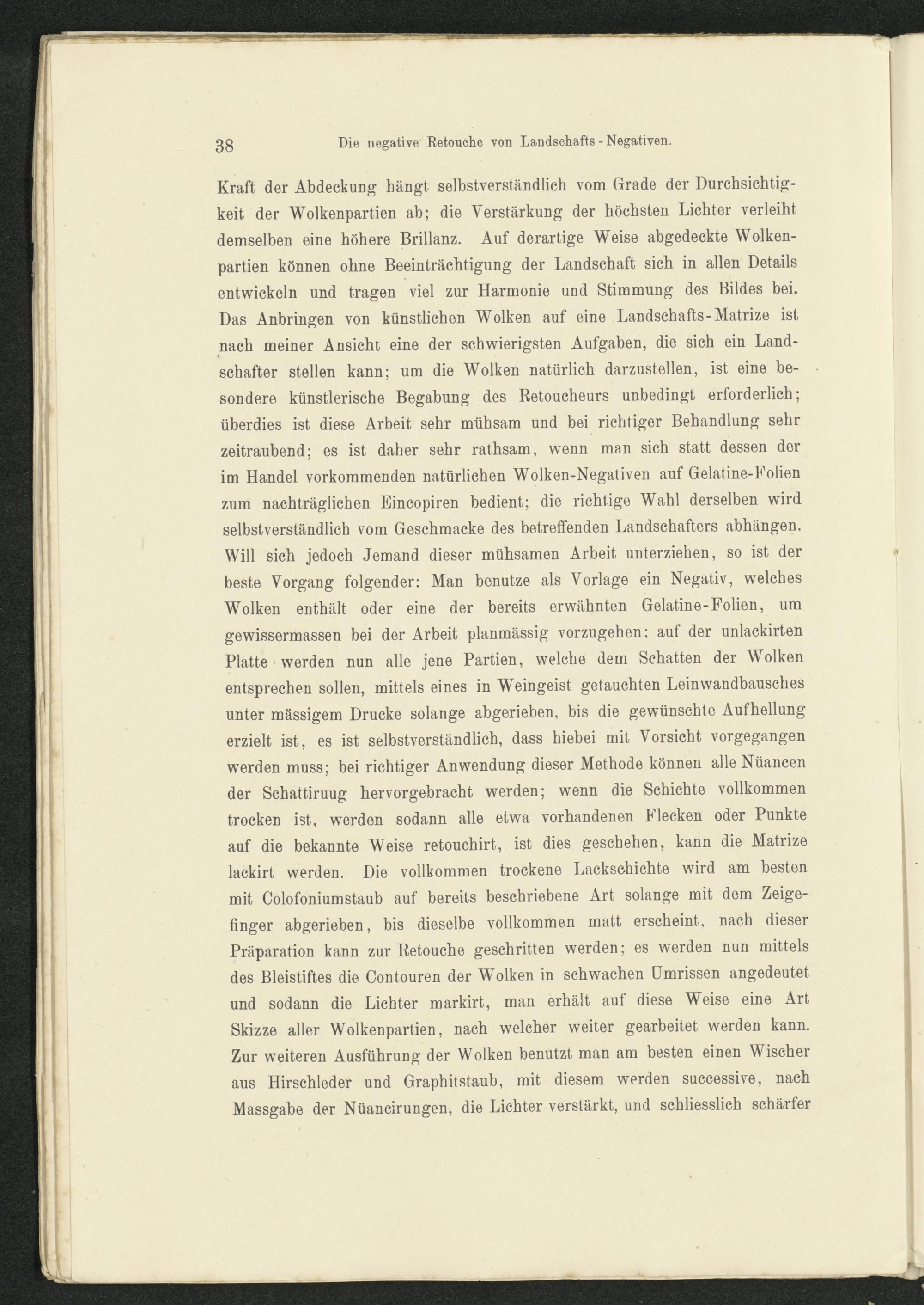 Kraft der Abdeckung bängt, selbstverständlich vom Grade der Durchsichtig-keit der Wolkenpartien ab; die Verstärkung der höchsten Lichter verleihtdemselben eine höhere Brillanz. Auf derartige Weise abgedeckte Wolken-partien können ohne Beeinträchtigung der Landschaft sich in allen Detailsentwickeln und tragen viel zur Harmonie und Stimmung des Bildes bei.Das Anbringen von künstlichen Wolken auf eine Landschafts-Matrize istnach meiner Ansicht eine der schwierigsten Aufgaben, die sich ein Land-schafter stellen kann; um die Wolken natürlich darzustellen, ist eine be-sondere künstlerische Begabung des Retoucheurs unbedingt erforderlich;überdies ist diese Arbeit sehr mühsam und bei richtiger Behandlung sehrzeitraubend; es ist daher sehr rathsam, wenn man sich statt dessen derim Handel vorkommenden natürlichen Wolken-Negativen auf Gelatine-Folienzum nachträglichen Eincopiren bedient; die richtige Wahl derselben wirdselbstverständlich vom Geschmacke des betreffenden Landschafters abhängen.Will sich jedoch Jemand dieser mühsamen Arbeit unterziehen, so ist derbeste Vorgang folgender: Man benutze als Vorlage ein Negativ, welchesWolken enthält oder eine der bereits erwähnten Gelatine-Folien, umgewissermassen bei der Arbeit planmässig vorzugehen; auf der unlackirtenPlatte werden nun alle jene Partien, welche dem Schatten der Wolkenentsprechen sollen, mittels eines in Weingeist getauchten Leinwandbauschesunter mässigem Drucke solange abgerieben, bis die gewünschte Aufhellungerzielt ist, es ist selbstverständlich, dass hiebei mit Vorsicht vorgegangenwerden muss; bei richtiger Anwendung dieser Methode können alle Nüancender Schattiruug hervorgebracht werden; wenn die Schichte vollkommentrocken ist, werden sodann alle etwa vorhandenen Flecken oder Punkteauf die bekannte Weise retouchirt, ist dies geschehen, kann die Matrizelackirt werden. Die vollkommen trockene Lacksehichte wird am bestenmit Colofoniumstaub auf bereits beschriebene Art solange mit dem Zeige-finger abgerieben, bis dieselbe vollkommen matt erscheint, nach dieserPräparation kann zur Retouche geschritten werden; es werden nun mittelsdes Bleistiftes die Contouren der Wolken in schwachen Umrissen angedeutetund sodann die Lichter markirt, man erhält auf diese Weise eine ArtSkizze aller Wolkenpartien, nach welcher weiter gearbeitet werden kann.Zur weiteren Ausführung der Wolken benutzt man am besten einen Wischeraus Hirschleder und Graphitstaub, mit diesem werden successive, nachMassgabe der Nüancirungen, die Lichter verstärkt, und schliesslich schärfer
