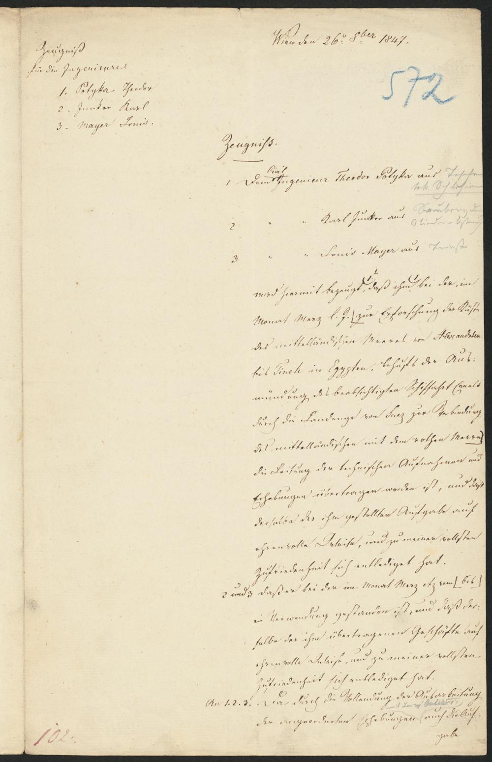 Wien den 26. 8ber 1847.Zeugniß1 dem Civil Ingenieur Theodor Potyka aus Teschenkk. Schlesien2"" Karl Junker aus SaubersdorfNieder-Österreich3"" Louis Mayer aus Triestwird hiermit bezeugt, 1: daß ihm 1 bei der, imMonat Maerz l. J.(zur Erforschung der Küstedes mittelländischen Meeres von Alexandrienbis Tineh in Egypten, behufs der Aus-mündung des beabsichtigten Schiffahrt Canalsdurch die Landenge von Suez zur Verbindung