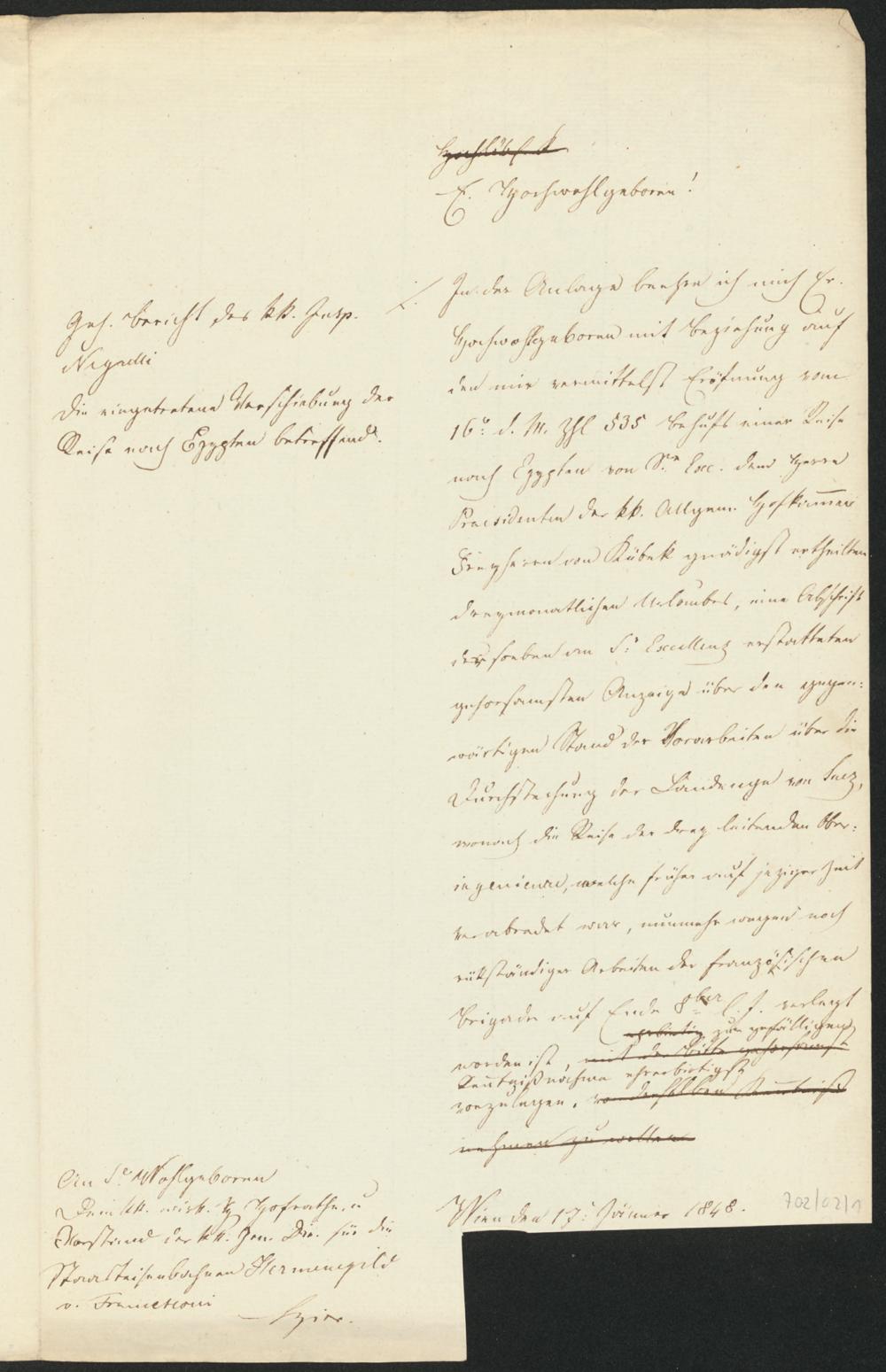 E. Hochwohlgeboren!In der Anlage beehre ich mich Er.Hochwohlgeboren mit Beziehung aufden mir vermittelst Eröfnung vom16. d. M. Zhl. 535 Behufs einer Reisenach Egypten von Sr. Exc. dem HerrnPraesidenten der kk. Allgem. HofkammerFreyherrn von Kübek gnädigst ertheiltendreymonatlichen Urlaubes, eine Abschriftder soeben an S. Excellenz erstattetengehorsamsten Anzeige über den gegen-wärtigen Stand der Vorarbeiten über dieDurchstechung der Landenge von Suez,wonach die Reise der drey leitenden Ober-ingenieure, welche früher auf jeziger Zeit