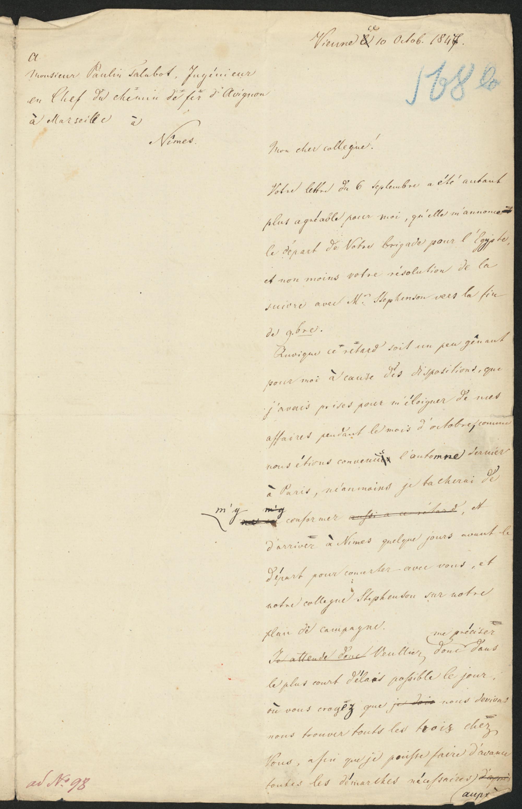 AVienne le 10 Octobre 1847ceMonsieur Paulin Talabot, Ingénieuren Chef du chemin de fer d’Avignonà Marseille àNîmes.Mon cher collegue!Votre lettre du 6 septembre a été autantplus agréable pour moi, qu’elle m’annoncele départ de Votre brigade pour l' Egypte,et non moins votre résolution de lasuivre avec Mr Stephenson vers la finde 9bre.[Auvigne] ce retard soit un peu gênantpour moi à cause des dispositions, quej’avais prises pour m’éloigner de mesaffaires pendant le mois d'octobre, commenous étions convenus l'automnedernvierà Paris, ne' anmoires je ta cherai demym'yconformer aussi à rétard, etd'arriver à Nimes quelque jours avant ledépart pour concerter avec vous, etnotre collegue Stephenson sur notreplan de campagne.me préciterJe attende donc Veulliez, donc dansle plus court délais possible le jour,où vous croyez que je doi vous devionsnous trouver touts les trois chezVous, afin que je pousse faire d'avancetoutes les démarches nécessaires d'aprèsaupr[...]