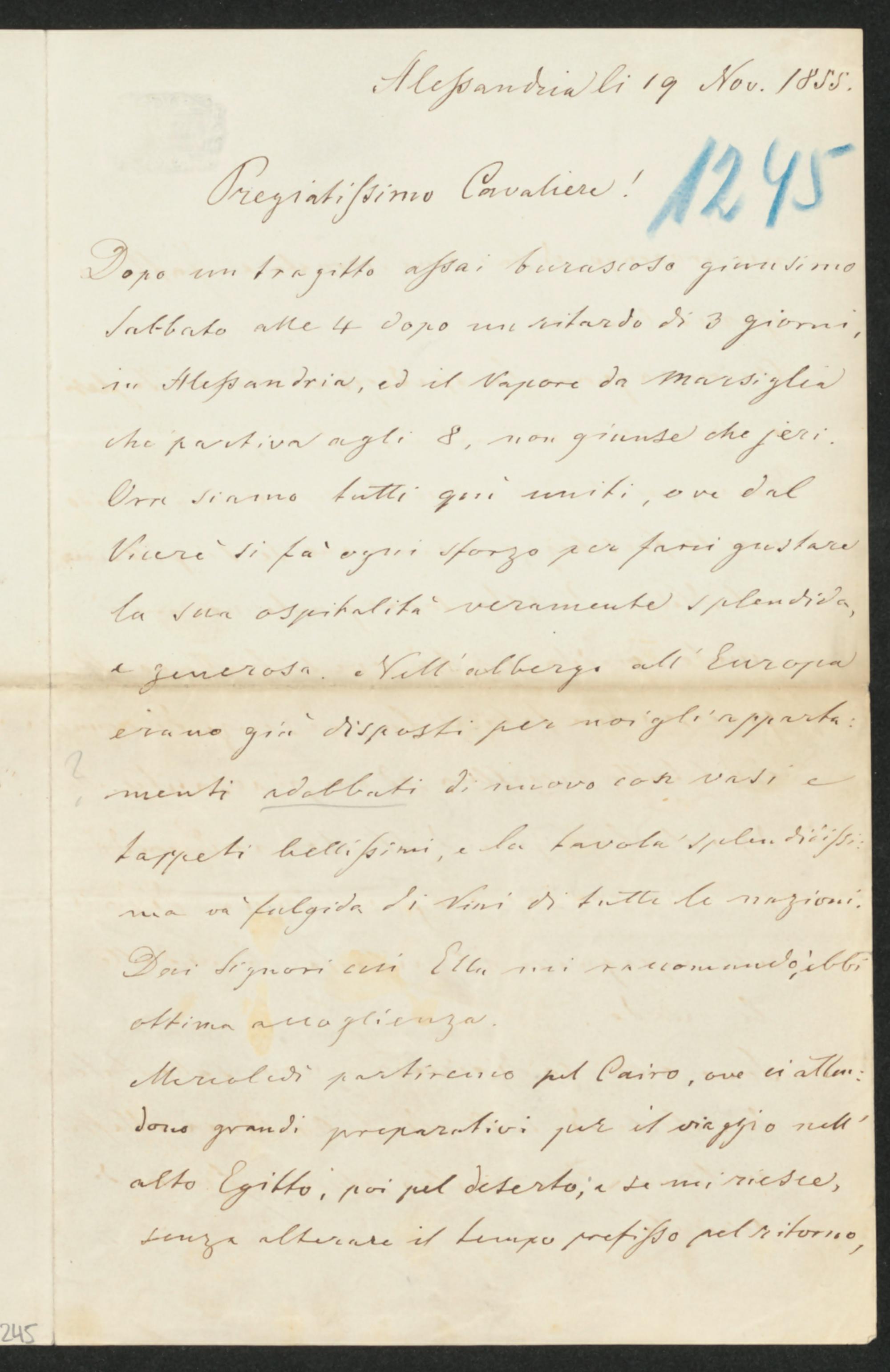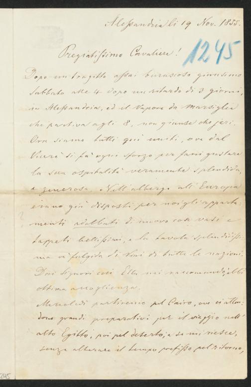 Dopo un tragitto assai burascoso giunsimoSabbato alle 4 dopo un ritardo di 3 giorni,in Alessandria, ed il Vapore da Marsigliache partiva agli 8, non giunse che jeri.Ora siamo tutti qui uniti, ove dalVicerè si fà ogni sforzo per farci gustarela sua ospitalità veramente splendida,e generosa. Nell'albergo all'Europa