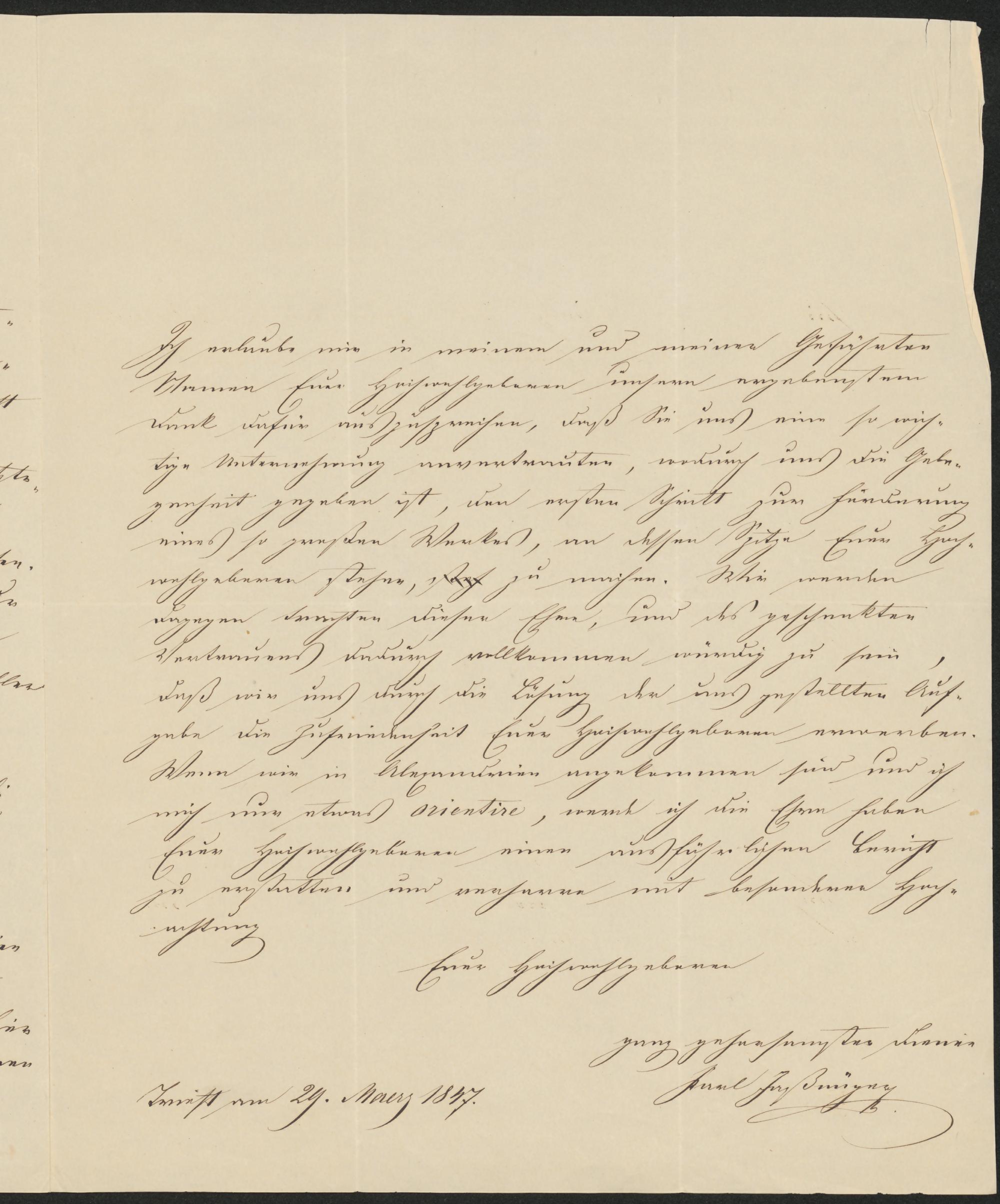 daß wir uns durch die Lösung der uns gestellten Auf-gabe die Zufriedenheit Euer Hochwohlgeboren erwerben.Wenn wir in Alexandrien angekommen sind und ichmich nur etwas orientire, werde ich die Ehre habenEuer Hochwohlgeboren einen ausführlichen Berichtzu erstatten und verharre mit besonderer Hoch-achtungEuer Hochwohlgeborenganz gehorsamster DienerKarl Jaßnüger Triest am 29. Maerz 1847.