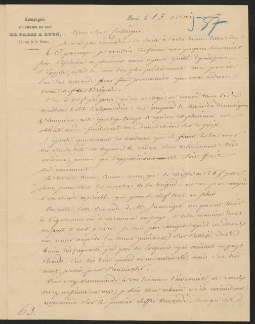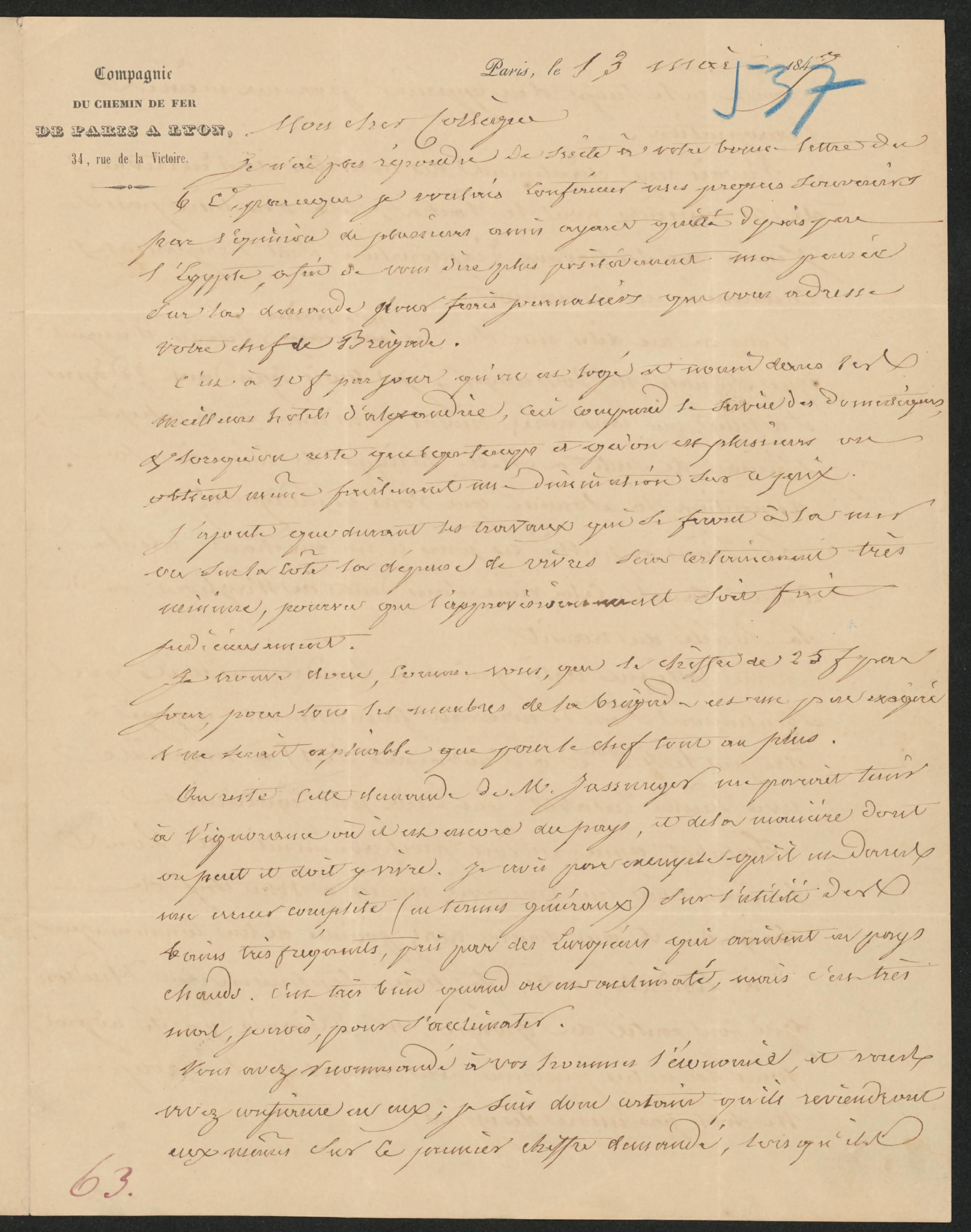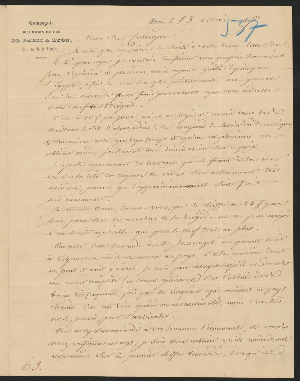 CompagnieDU CHEMIN DE FERDE PARIS A LYON,34, rue de la Victoire.Paris, le 13 mai 1847Mon cher CollègueJe n'ai pas répondu de suite à votre breve[?] lettre du6 Ce parceque je voulais confirmer mes propres souvenirspar l'opinion de plusieurs amis ayant quitté depuis peul'Egypte, afin de vous dire plus précisement[?] ma penséesur la demande pour frais[?] premature qui vous adressevotre chef de Brigade.C'est à 10f par jour qu'on est logé et nourri dans les[?]meilleurs hotels d'Alexandrie, ceci comprend le service des domestiques,et lorsqu'on reste quelque temps et qu'on est plusieurs onobtient même facilement une diminution sur ce prix.J'ajoute que durant les travaux qui se feront à la merou sur la côte la dépense de vivres sera certainement trèsminime, pourvu que l'approvisionnement soit faitjudicieusement.Je trouve donc, comme vous, que le chiffre de 25f parjour, pour tous les membres de la brigade est un peu exagéréet ne serait explicable que pour le chef tout au plus.Au reste cette demande de M(onsieur) Jassnuger ne parait tenirà l'ignorance où il est encore au pays, et de la manière donton peut et doit y vivre. Je crois par exemple qu'il est dansune erreur complète(en termes généraux) sur l'utilité desbains très fréquents, pris par des Européens qui arrivent en payschauds. C'est très bien quand ou est acclimaté, mais c'est trèsmal, je crois, pour s'acclimater.Vous avez recommandé a vos hommes l'économie et vousavez confiance en eux; je suis donc certain qu'ils reviendronteux mêmes sur le premier chiffre demandé, lors qu'ils