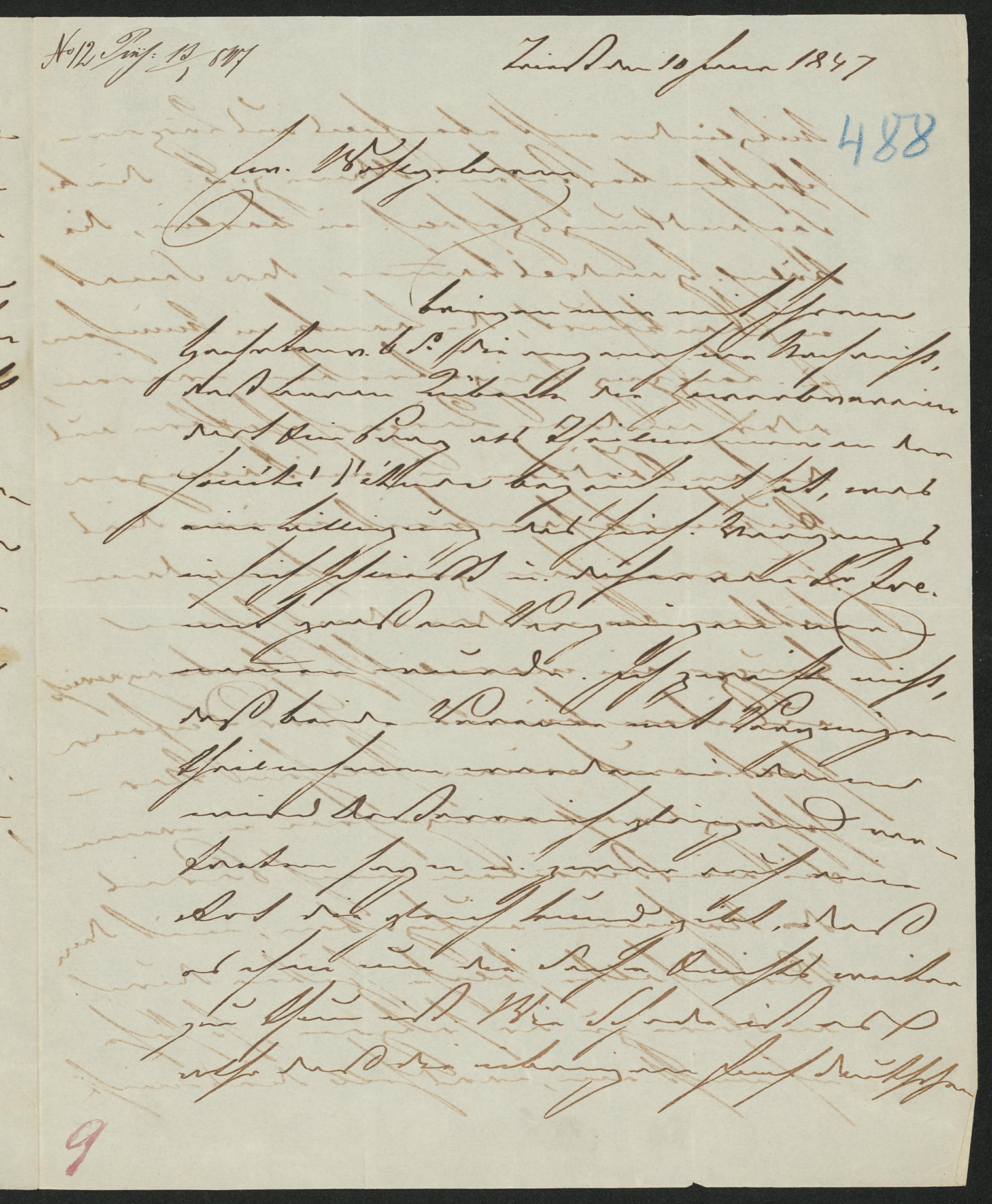 N° 12 Präs(entatum) 13/1(1)847Triest den 10. Jänner 1847Eu(er) Wohlgeborenbringen mir mit IhremGeehrten v(om) 6. d(ieses) die angenehme Nachricht,daß Baron Kübeck die Gewerbvereinedort& in Prag als Theilnehmer an derSociété d’étude bezeichnet hat, waseine Billigung des hies(igen) Vorgangsin sich schließt u(nd) daher von S(eine)r Exc(ellenz)mit großem Vergnügen ver-nom(m)en wurde. Ich zweifle nicht,daß beide Vereine mit Vergnügentheilnehmen werden u(nd) dannwird Oesterreich glänzend ver-treten seyn u(nd) zwar auf eineArt die gleich kund gibt, daßes ihm um die Sache& nichts weiterzu thun ist. Wie schade ist esalso, daß die übrigen fünf deutschen