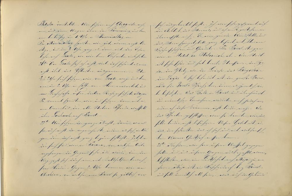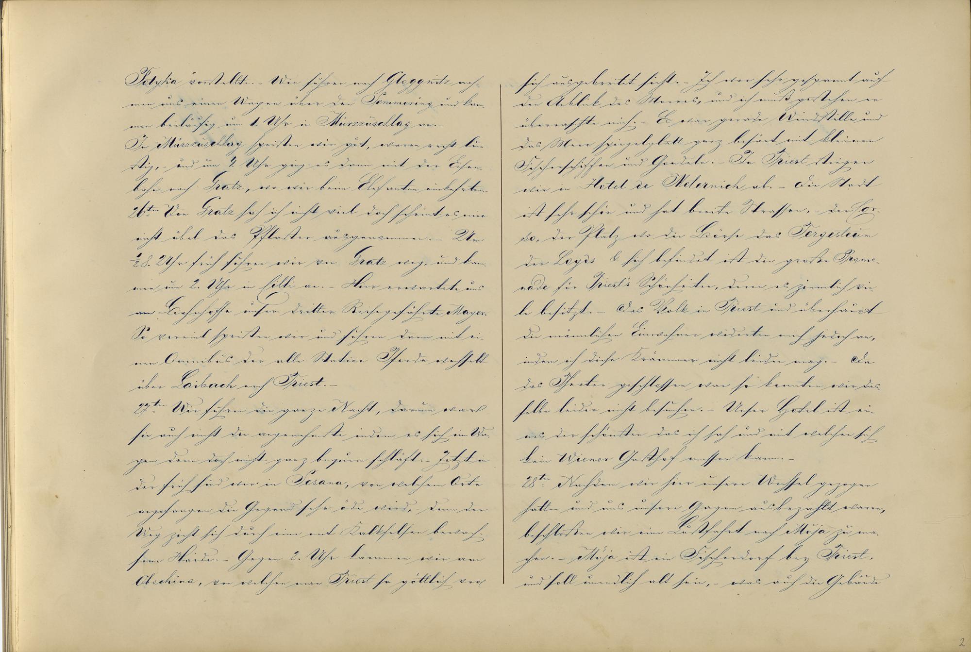 Potyka vorstellte . Wir fuhren nach Gloggnitz nah-men uns einen Wagen über den Semmering1 und kam-men beiläufig um 1. Uhr in Mürzzuschlag an.-In Mürzzuschlag speisten wir gut, waren recht lu-stig,- und um 4. Uhr ging es dann mit der Eisen-bahn nach Gratz , wo wir beim Elefanten2 einkehrten.26.ter Von Gratz sah ich nicht viel doch scheint es mirnicht übel das Pflaster ausgenommen.- Um½ 8. Uhr früh fuhren wir von Gratz weg, und kam-men um 2. Uhr in Cilli an.- Hier erwartete unsam Bahnhoffe unser dritter Reisegefährte Mayer .So vereint speisten wir und fuhren dann mit ei-nen Omnibus 3 der alle Station Pferde wechseltüber Laibach nach Triest .27.ten Wir fuhren die ganze Nacht, darum warsie auch nicht die angenehmste indem es sich im Wa-gen denn doch nicht ganz bequem schläft. Jetzt inder Früh sind wir in Sesana , von welchem Orteangefangen die Gegend sehr öde wird,- denn derWeg zieht sich durch eine mit Kalkfelsen bewach-sene Haide. - Gegen 2. Uhr kammen wir amObschina , von welchen man Triest so göttlich vor