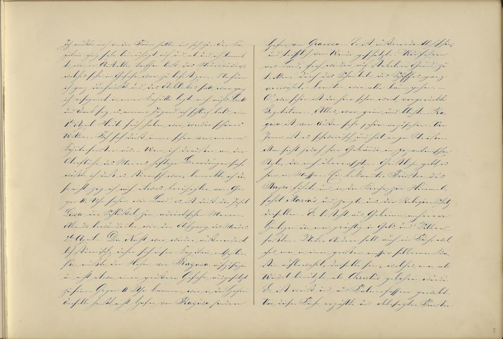 Hafen von Gravosa .- Er ist außerordentlich schön,und trefflich vom Winde geschützt. Wir fuhrenans Land, froh wieder auf stabilern Grund zutretten, durch das Schaukeln des Schiffes ganzverwöhnt,- konnten wir alle kaum gehen.O! wie schön ist die hier schon weit vorgerückteVegetation.- Alles war grün und blühte.- Ra-gusa ist von Außen sehr schön anzusehen.- VonInnen ist es schweinisch und hat enge Straßen.Man sieht jedoch hier Gebäude im pizantinischenStyle, die mich überraschten.3 Geistliche gibt eshier in Massa.- Ein bekannter Priester desMayer führte uns in die Kirche zur Himmel-fahrt Maria ’s und zeigte uns den Reliqien Schatzderselben.- Er besteht aus Gebeinen mehrererHeiliger die man prächtig in Gold und Silberfaßte.- Unter Andern soll auch ein Tuch, wel-ches man in einen großen massiv silbernen Ka-sten aufbewahrt, dasselbe sein, welches man alsWindel benützte als Christus gebohren wurde.Es ist weiß und aus Palmenfassern gewebt.Von diesen Tuche erzählte uns obbesagter Priester