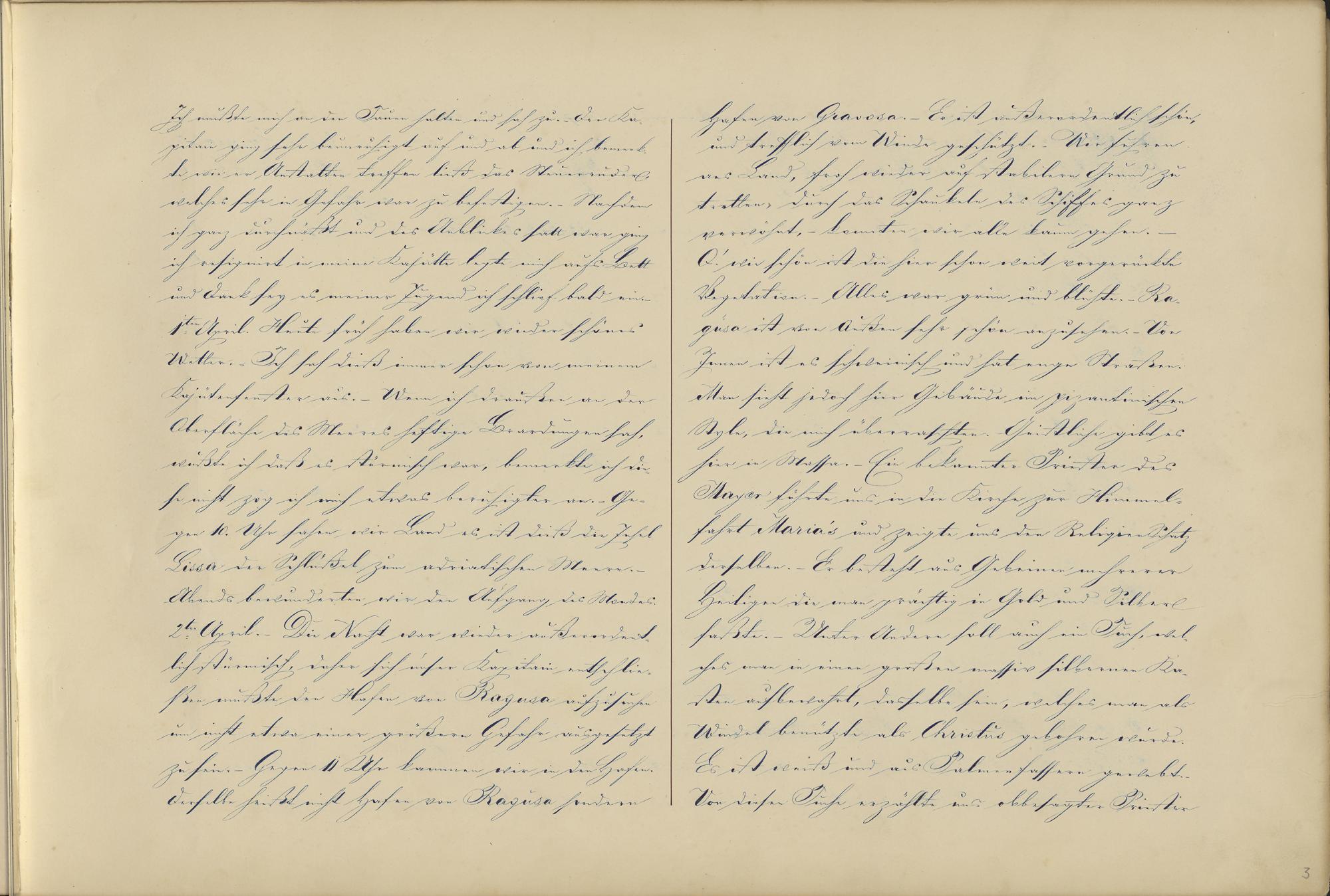 Ich mußte mich an den Tauen halten und sah zu.- Der Ka-pitain ging sehr beunruhigt auf und ab und ich bemerk-te wie er Anstalten treffen ließ das Steuerruderwelches sehr in Gefahr war zu befestigen.- Nachdemich ganz durchnäßt und des Anblickes satt war gingich resignirt in meine Kajütte legte mich aufs Bettund Dank sey es meiner Jugend ich schlief bald ein.1.ten April. Heute früh haben wir wieder schönesWetter.- Ich sah dieß immer schon von meinemKajütenfenster aus.- Wenn ich draußen an derOberfläche des Meeres heftige Brandungen sah,wußte ich daß es stürmisch war, bemerkte ich die-se nicht zog ich mich etwas beruhigter an. Ge-gen 10. Uhr sahen wir Land es ist dieß die InselLissa1 der Schlüßel zum adriatischen Meere .Abends bewunderten wir den Aufgang des Mondes.2.te April.- Die Nacht war wieder außerordent-lich stürmisch, daher sich unser Kapitain entschlie-ßen mußte den Hafen von Ragusa 2 aufzusuchenum nicht etwa einer größern Gefahr ausgesetztzu sein.- Gegen 11 Uhr kommen wir in den Hafen.Derselbe heißt nicht Hafen von Ragusa sondern