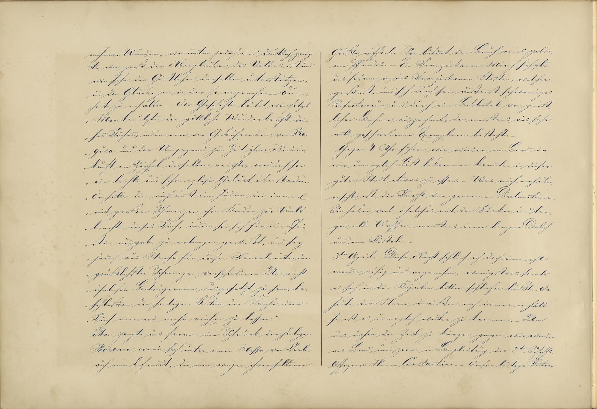 3.te April. Diese Nacht schlief ich doch einmahlwieder ruhig und angenehm , wenigstens so alses sich in den Kajüten bitten schlafen läßt. Daheute der Sturm draußen noch immer anhältso ist es unmöglich weiter zu kommen. - Umuns daher die Zeit zu kürzen gingen wir wiederans Land, und zwar in Begleitung des 2ten Schiffs-Offiziers Herrn Constantini. - Dieser lustige Patron