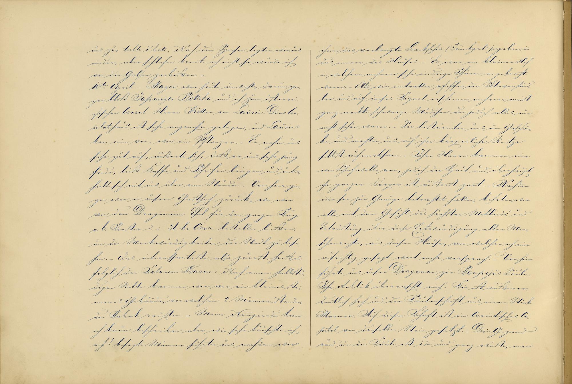 uns zur table d'hote1 . Nach dem Speisen legten wir unsnieder. aber schlafen konnte ich nicht so wurde ichvon den Gelsen2 zerbißen. -10ten April. - Mayer war heute unwohl, darum gin-gen bloß Jahsmiger Pottika und ich zum österrei-chischen Consul Herrn Ritter von Laurin . Das Con-sulathaus ist sehr angenehm gelegen, und Laurinkam mir vor, wie ein Pflanzer. - Er nahm unssehr gut auf, äußerte sich, daß er uns sehr jungfinde, ließ Kaffe und Pfeifen bringen und unter-hielt sich mit uns über eine Stunde. [Aquarellzeichnung] - Von hier gin-gen wir in unsern Gasthof zurück, wo wirvon dem Dragoman 3 Esel für den ganzen Taga 6. Piaster d. i. 36. kr. Cmze bestellen ließen,um die Merkwürdigkeiten der Stadt zu bese-hen. - Das interessanteste also zuerst , hieß esfolglich den - Bazar Glossar ::: zum Glossareintrag  Bazar : Nach einem halbstün-digen Ritte kammen wir vor ein kleines stei-nernes Gebäude, vor welchem 2 . Männer standen,die Tabak rauchten. - Meine Neugierde kannich kaum beschreiben aber wie sehr täuschte ichmich ! besagte Männer führten uns nachdem wir