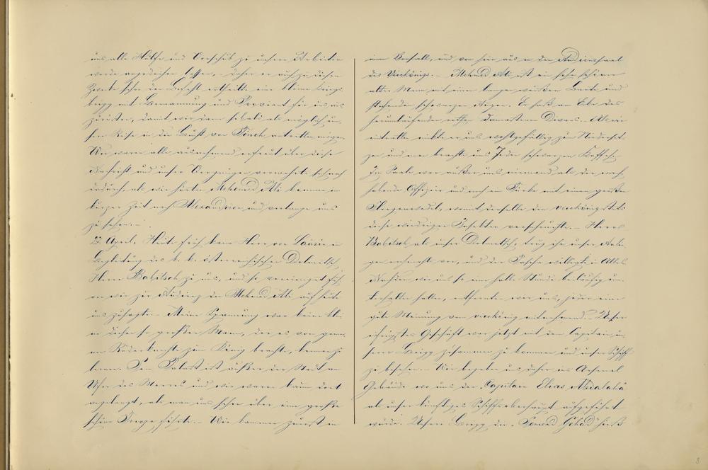 einen Vorsall, und von hier aus in den Audienzsaaldes Vicekönigs. - Mehmed Ali ist ein sehr schöneralter Mann mit einem langen weißen Barte undstechenden schwarzen Augen. Er saß am Ecke desherumlaufenden rothen damastenen Divans. - Als wireintrathen nickte er uns wohlgefällig zum Niederset-zen und man brachte uns Jeden schwarzen Kaffeh.Im Saale war außer uns niemand als der wach-habende Offizier und noch ein Türke mit einen großenFliegenwedel, womit derselbe den Vicekönig stetsdiese wiedrigen Insekten verscheuchte. [Aquarellzeichnung] - HerrBabitsch als unser Dolmetsch, trug ihn unser Anlie-gen nochmahls vor, und der willigte in Alles.Nachdem wir uns so eine halbe Stunde beiläufig un-terhalten hatten, entfernten wir uns, jeder einegute Meinung vom Vicekönig mitnehmend3 . - Unsereifrigstes Geschäft war jetzt mit dem Capitain un-serer Brigg zusammen zu kommen und unser Schiffzu besehen. - Wir begaben uns daher ins ArsenalGebäude wo uns der "Capitain Elias Abdalaha"als unser künftiges Schiffsoberhaupt aufgeführtwurde. Unsere Brigg4 die „Semend Gehad“ hieß