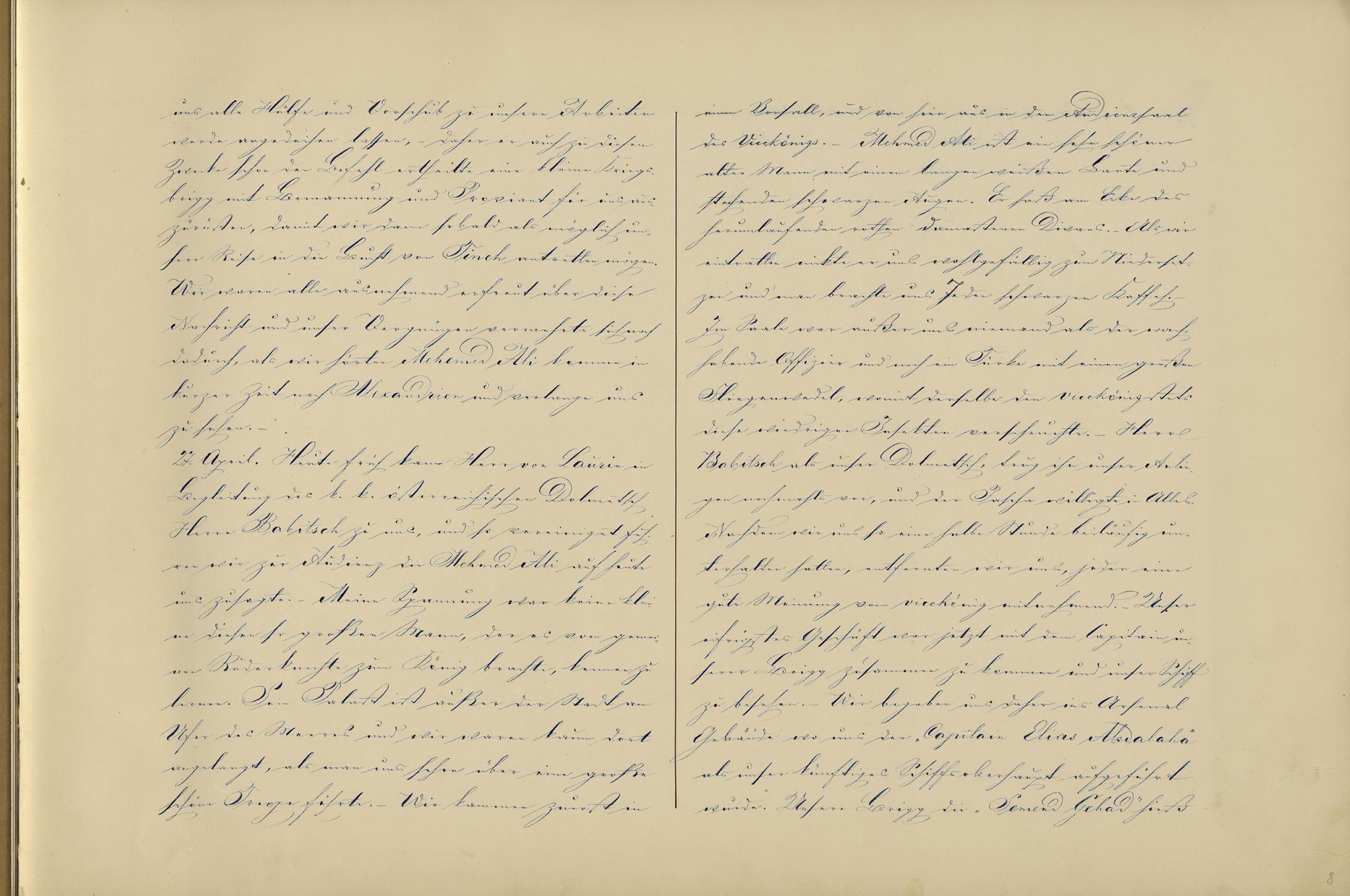 uns alle Hülfe und Vorschub zu unsere Arbeitenwerde angedeihen lassen, - daher er auch zu diesemZwecke schon der Befehl ertheilte eine kleine Kriegs-brigg mit Bemannung und Proviant für uns aus-zurüsten, damit wir dann sobald als möglich un-sere Reise in die Bucht von Tineh antrethen mögen.1Wir waren alle ausnehmend erfreut über dieseNachricht und unser Vergnügen vermehrte sich nochdadurch, als wir hörten Mehemed Ali komme inkurzer Zeit nach Alexandrien und verlange unszu sehen.27. April. Heute früh kam Herr von Laurin inBegleitung des k. k. österreichischen DolmetschHerrn Babitsch zu uns, und so vereiniget fuh-ren wir zur Audienz die Mehmed Ali auf heuteuns zusagte. - Meine Spannung war keine klei-ne diesen so großen Mann , der es vom gemei-nen Ruderknechte zum König brachte2 , kennen zulernen. Sein Palast ist außer der Stadt amUfer des Meeres und wir waren kaum dortangelangt, als man uns schon über eine großeschöne Trepe führte. - Wie kammen zuerst in