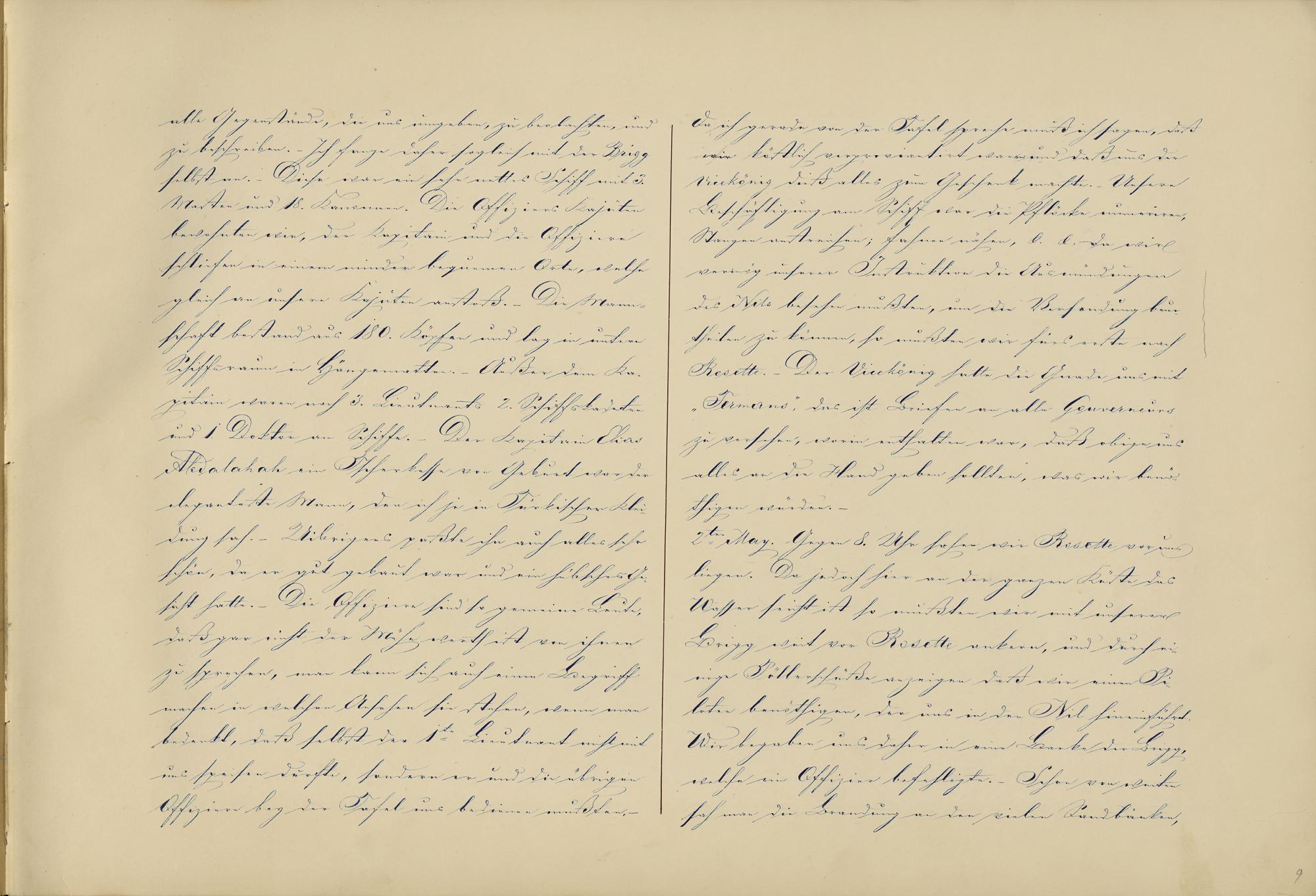 Da ich gerade von der Tafel spreche muß ich sagen, daßwir köstlich verproviantirt waren und daß uns derVicekönig dieß alles zum Geschenk machte.- UnsereBeschäftigung am Schiff war die Pflöcke nummeriren,Stangen anstreichen; Fahnen nähen3,&.&. Da wirvermög unserer Instruktion die Ausmündungendes Nils besehen mußten, um die Versandung beur-theilen4 zu können, so mußten wir fürs erste nachRosette .– Der Vicekönig hatte die Gnade uns mit"Fermans Glossar ::: zum Glossareintrag Fermans5", das ist Briefen an alle Gouverneurszu versehen, worin enthalten war, daß obige unsalles an die Hand geben sollten, was wir benö-thigen wurden.2t May. Gegen 8. Uhr sahen wir Rosette vor unsliegen. Da jedoch hier an der ganzen Küste dasWasser seicht ist so mußten wir mit unsererBrigg weit vor Rosette ankern, und durch ei-nige Pöllerschüße anzeigen, daß wir einen Pi-loten benöthigen, der uns in den Nil hineinführt.Wir begaben uns daher in eine Barke der Brigg,welche ein Offizier befehligte.- Schon von weitensah man die Brandung an den vielen Sandbänken,