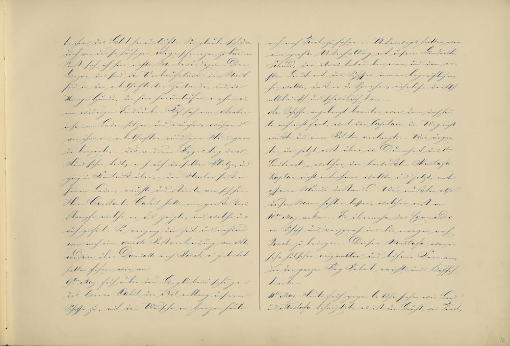 noch nach Tineh zu fahren. - Unterwegs hatten wireine große Unterhaltung mit unsern BedientenSchmid, der etwas betrunken war und dem er-sten Lieutnant des Schiffes immer begreiflich ma-chen wollte, daß er 3 . Sprachen, nähmlich deutschaltbairisch und schwäbisch kann. -Am Schiffe angelangt konnten wir denn doch heu-te noch nicht fort, weil der Capitain den Weg nichtwußte und einen Piloten verlangte - Wir ärger-ten uns jetzt erst über die Dummheit des 1teLieutnants, welcher den bewußten Mustafa