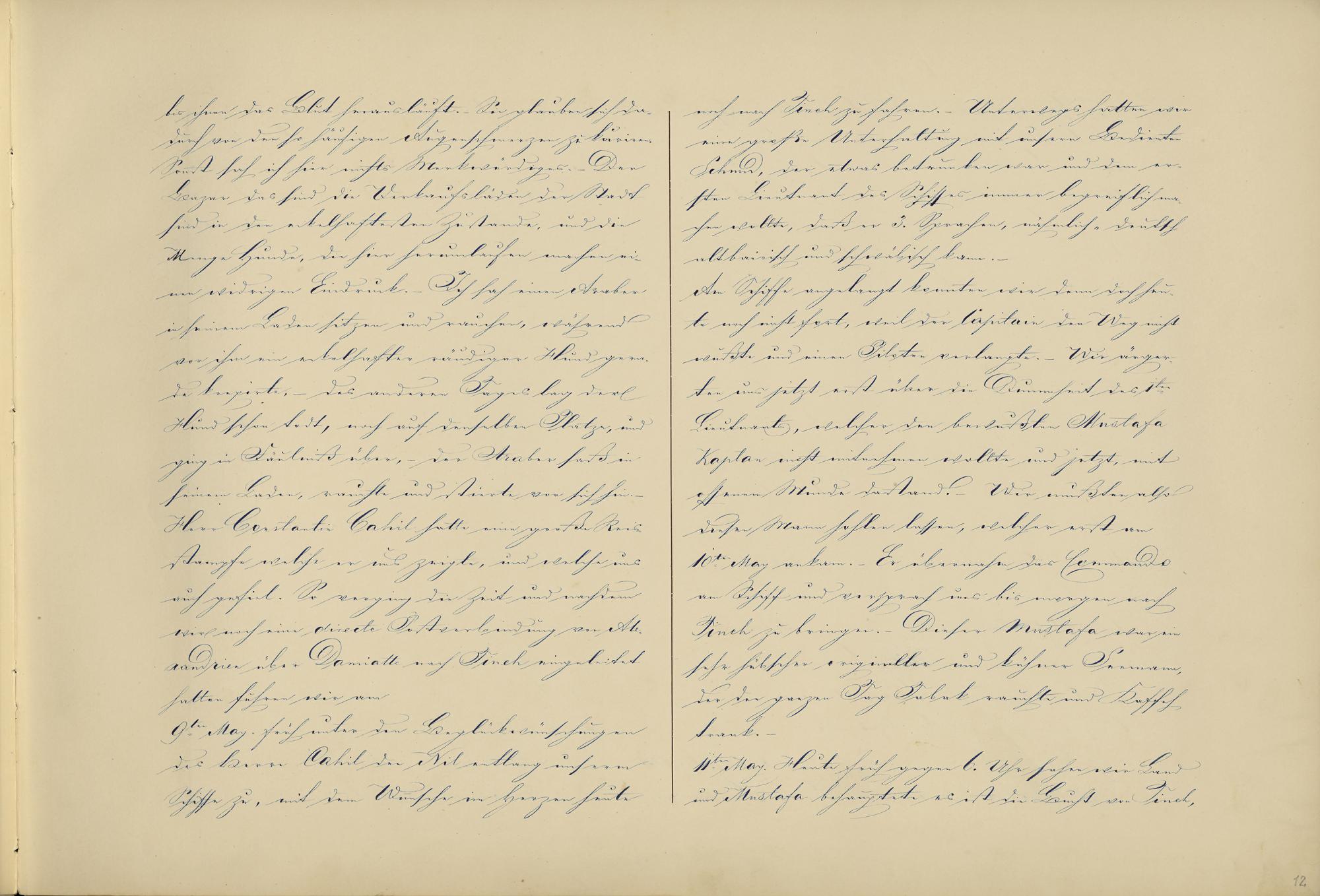 bis ihnen das Blut herausläuft. - Sie glauben sich da-durch von den so häufigen Augenschmerzen zu kuriren.1Sonst sah ich hier nichts Merkwürdiges. - DerBazar Glossar ::: zum Glossareintrag Bazar das sind die Verkaufsläden der Stadtsind in dem eckelhaftesten Zustande, und dieMenge Hunde, die hier herumlaufen machen ei-nen widrigen Eindruck2 . - Ich sah einen Araber in seinem Laden sitzen und rauchen, währendvor ihm ein eckelhafter räudiger Hund gera-de krepirte, - des anderen Tages lag derHund schon todt, noch auf denselben Platze, undging in Fäulniß über, - der Araber saß inseinem Laden, rauchte und stierte vor sich hin. -Herr Constantin Cahil hatte eine große Reis-stampfe welche er uns zeigte, und welche unsauch gefiel. So verging die Zeit und nachdemwir noch eine directe Postverbindung von Ale-xandrien über Damiatte nach Tineh eingeleitethatten fuhren wir am9te May. früh unter den Beglückwünschungendes Herrn Cahil den Nil entlang unsermSchiffe zu, mit dem Wunsche im Herzen heute