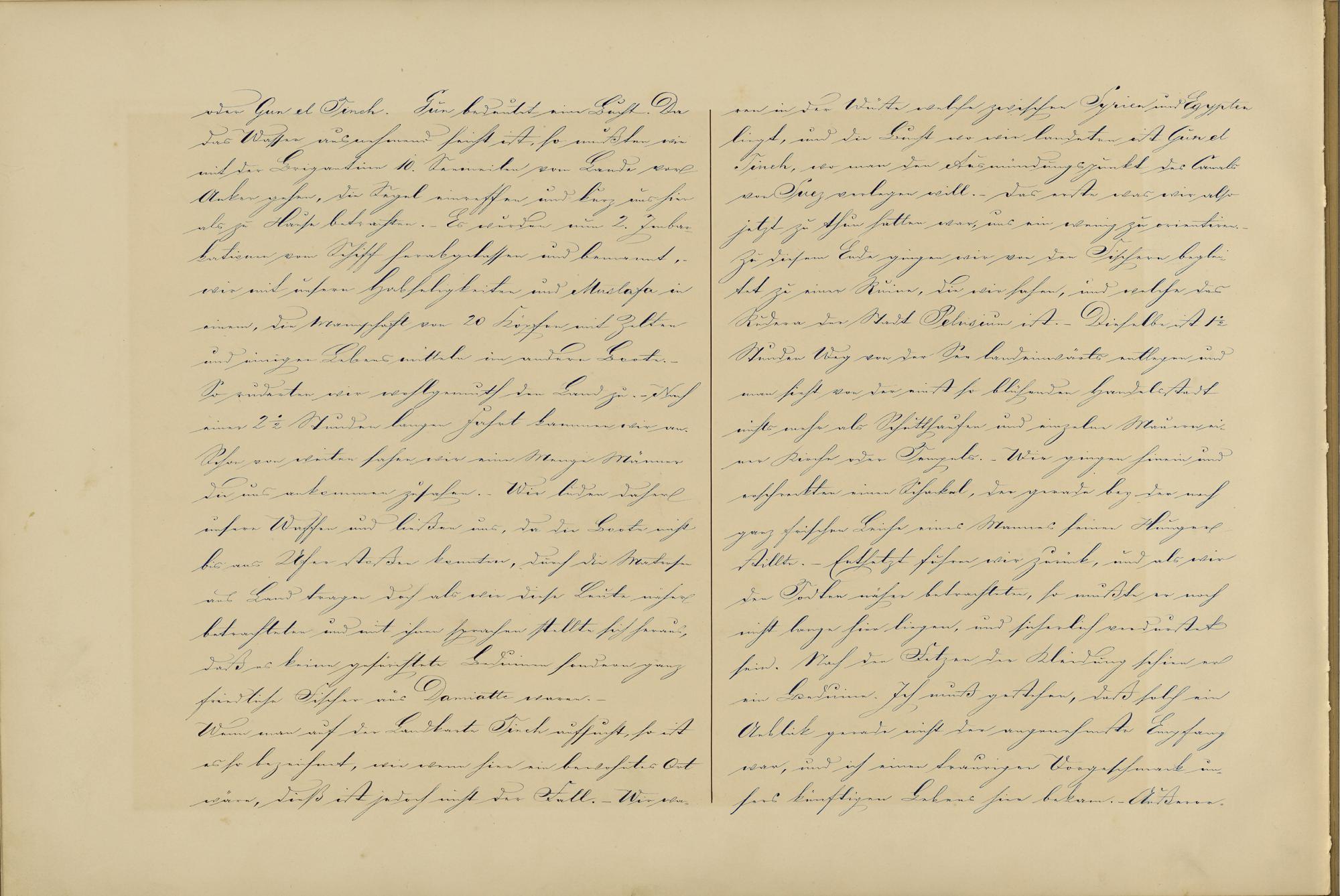 ren in der Wüste welche zwischen Syrien und Egyptenliegt, und die Bucht wo wir landeten ist Gun elTineh, wo man den Ausmündungspunkt des Canals von Suez verlegen will.- Das erste was wir alsojetzt zu thun hatten war, uns ein wenig zu orientiren.Zu diesem Ende gingen wir von den Fischern beglei-tet zu einer Ruine, die wir sahen, und welche dasRudera4 der Stadt Pelusium ist.- Dieselbe ist 1 ½Stunden Weg von der See landeinwärts entlegen undman sieht von der einst so blühenden Handelsstadtnichts mehr als Schutthaufen und einzelne Mauern ei-ner Kirche oder Tempels.- Wir gingen hinein underschreckten einen Schackal, der gerade bey der nochganz frischen Leiche eines Mannes seinen Hungerstillte.- Entsetzt fuhren wir zurück, und als wirden Todten näher betrachteten, so mußte er nochnicht lange hier liegen, und sicherlich verdurstetsein. Nach den Fetzen der Kleidung schien erein Beduine Glossar ::: zum Glossareintrag Beduine. Ich muß gestehen, daß solch einAnblick gerade nicht der angenehmste Empfangwar, und ich einen traurigen Vorgeschmack un-sers künftigen Lebens hier bekam.5 Außeror-