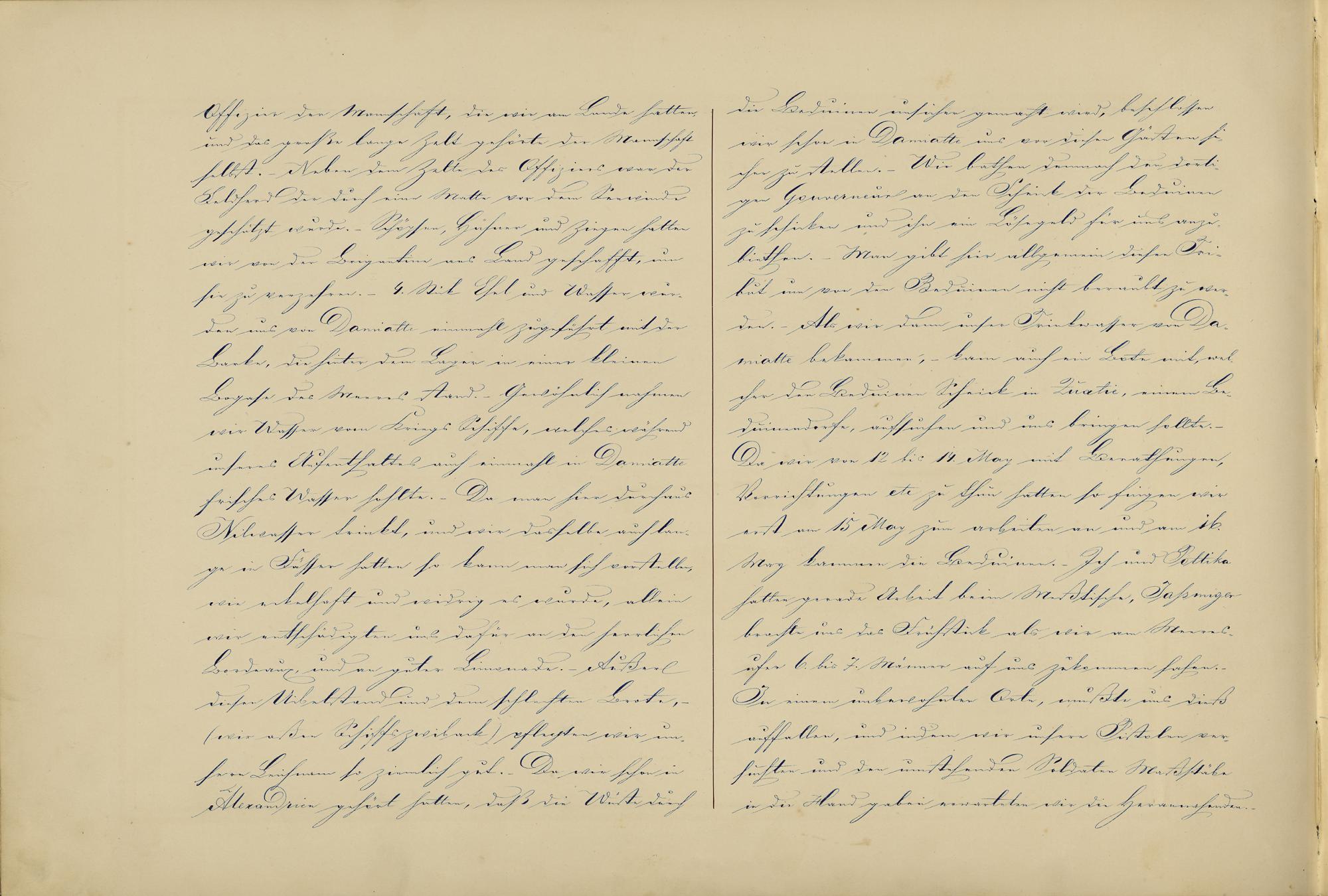 Offizier der Mannschaft, die wie am Lande hatten,und das große lange Zelt gehörte der Mannschaftselbst. Neben dem Zelte des Offiziers war derFeldherd der durch eine Matte vor dem Seewindegeschützt werde. [Aquarellzeichnung] - Schöpfen, Hühner und Ziegen hattenwir von der Brigantine ans Land geschafft, umsie zu verzehren.- 4. Stück Esel und Wasser wur-den uns von Damiatte einmahl zugeführt mit derBarke , die hinter dem Lager in einer kleinenBogase des Meeres stand.- Gewöhnlich nahmenwir Wasser vom Kriegs Schiffe, welches währendunseres Aufenthaltes auch einmahl in Damiattefrisches Wasser hohlte.- Da man hier durchausNilwasser trinkt, und wir dasselbe auch lan-ge in Fässer hatten so kann man sich vorstellen,wie eckelhaft und widrig es wurde, alleinwir entschädigten und dafür an den herrlichenBordeaux, und an guter Limonade.- Außerdiesen Uibelstand und dem schlechten Brote,(wir aßen Schiffszwiback) pflegten wir un-sern Leichnam so ziemlich gut.- Da wir schon inAlexandrien gehört hatten, daß die durch