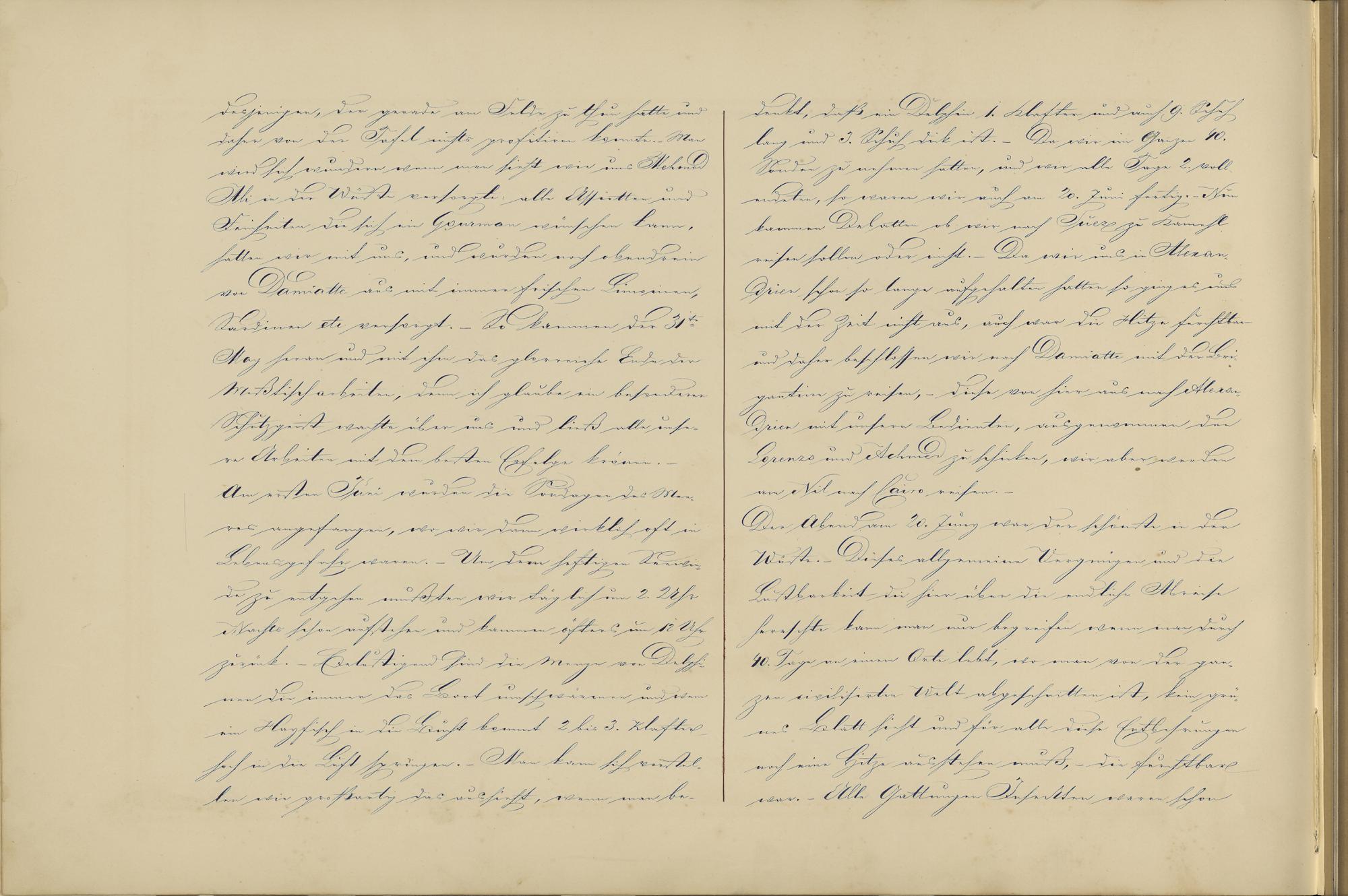 denkt, daß ein Delphin 1. Klafter und auch 9. Schuhlang und 3. Schuh dick ist.- Da wir im Ganzen 40.Sonden zu nehmen hatten, und wir alle Tage 2. voll-endeten, so waren wir auch am 20. Juni fertig.- Nunkammen Debatten ob wir nach Suez zu Kamehlreisen sollen oder nicht.- Da wir uns in Alexan-drien schon so lange aufgehalten hatten so ging es unsmit der Zeit nicht aus, auch war die Hitze furchtbarund daher beschlossen wir nach Damiatte mit der Bri-gantine zu reisen,- diese von hier aus nach Alexan-drien mit unsern Bedienten, ausgenommen denLorenzo und Achmed zu schicken, wir aber werdenam Nil nach Cairo reisen.Der Abend am 20. Juny war der schönste in derWüste.- Dieses allgemeine Vergnügen und dieLustbarkeit die hier über die endliche Abreiseherrschte kann man nur begreifen wenn man durch40. Tage an einem Orte lebt, wo man von der gan-zen civilisirten Welt abgeschnitten ist, kein grü-nes Blatt sieht und für alle diese Entbehrungennoch eine Hitze ausstehen muß,- die furchtbarwar.- Alle Gattungen Inseckten waren schon