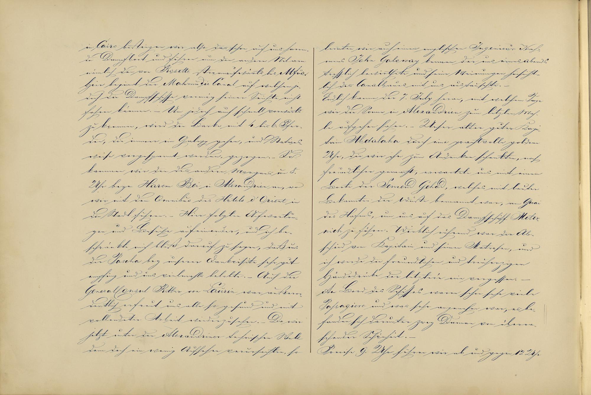 in Cairo bestiegen wir also das schon auf uns harren-de Dampfboot und fuhren nun den andern Nilarmnämlich den von Rosette stromaufwärts bis[?tfue]Hier beginnt der Mahmudie Canal auf welchem je-doch die Dampfschiffe vermög seiner Seichte nichtfahren können.- Um jedoch auch schnell vorwärtszu kommen, wird die Barke mit 4 bis 6 Pfer-den, die immer im Galopp gehen, und stations-weise vorgespannt werden, gezogen.- Sokammen wir den des andern Morgens um 8.Uhr beym Harmen Bei in Alexandrien an, wowir mit dem Omnibus des Hotels d'Orient indie Stadt fuhren.- Hier folgten Aufwartun-gen und Besuche aufeinandner, und ich be-schränkte mich bloß darauf zu sagen, daß unsder Pascha bey unserer Dankvisite sehr gutempfing und uns vielmals belobte.- Auch derGeneralConsul Ritter von Laurin war außeror-dentlich erfreut uns alle so gesund und mitvollendeter Arbeit wiederzusehen.- Da wirjetzt unter der Alexandriner technischen Weltdenn doch ein wenig Aufsehen verursachten, so