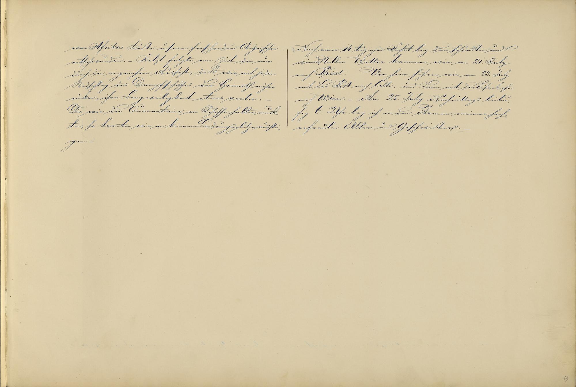 Nach einer 14.tägigen Fahrt bey dem schönsten undwindstillen Wetter kammen wir am 21. Julynach Triest. Von hier fuhren wir am 23. Julymit der Post nach Cilli , und dann mit der Eisenbahnnach Wien .- Am 25. July Nachmittags beiläu-fig 6. Uhr lag ich in den Armen meiner hoch-erfreuten Ältern und Geschwister.-