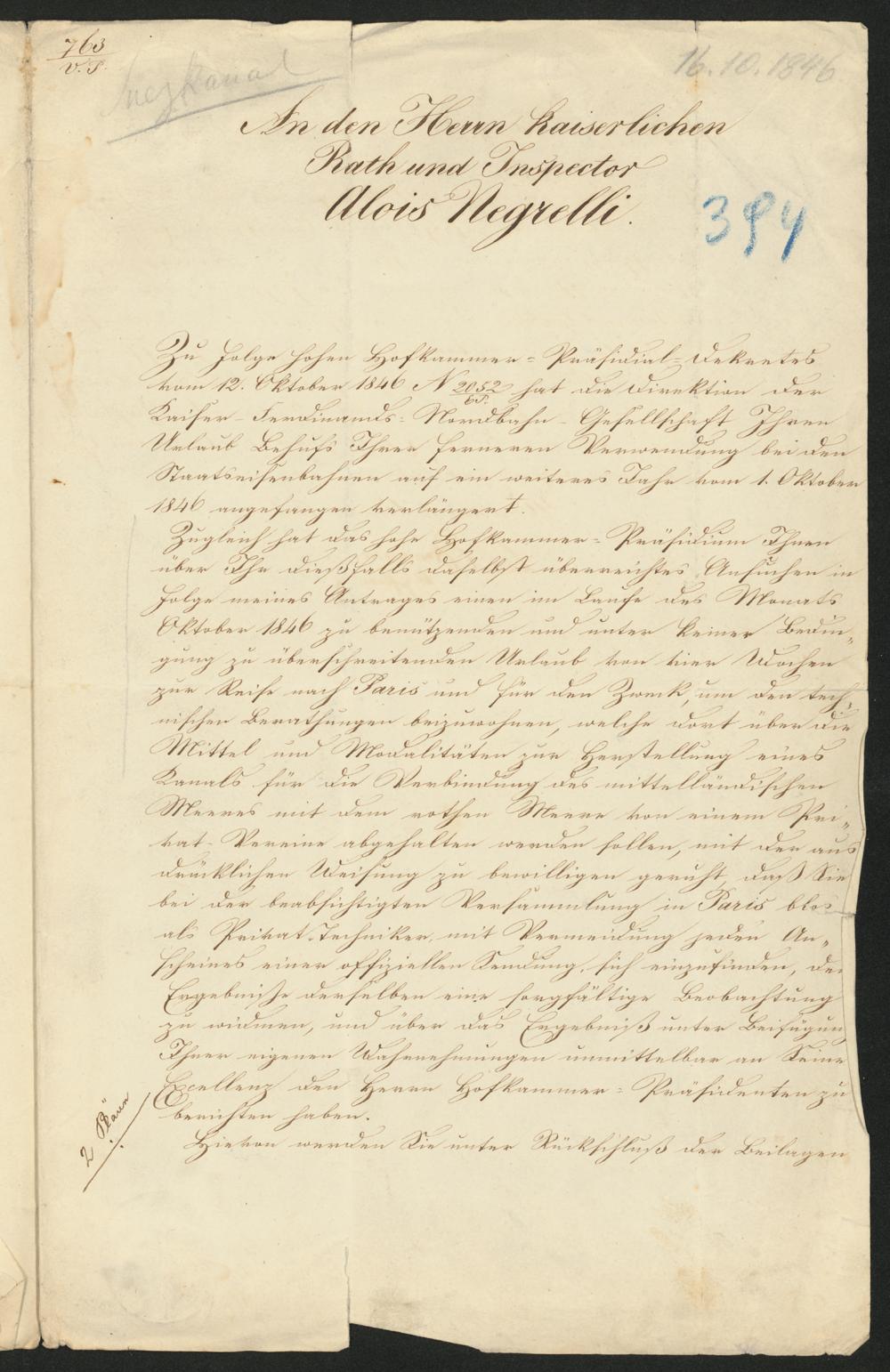 16. 10. 1846An den Herrn KaiserlichenRath und InspectorAlois NegrelliZu Folge hohen Hofkammer-Präsidial-Dekretesvom 12. Oktober 1846 N 2052/ET hat die Direktion derKaiser Ferdinand Nordbahn-Gesellschaft IhrenUrlaub behufs Ihrer ferneren Verwendung bei denStaatseisenbahnen auf ein weiteres Jahr vom 1. Oktober1846 angefangen verlängert.Zugleich hat das hohe Hofkammer-Präsidium Ihnenüber Ihr dießfalls daselbst überreichtes Ansuchen inFolge meines Antrages einen im Laufe des MonatsOktober 1846 zu benützenden und unter keiner Bedin-gung zu überschreitenden Urlaub von vier Wochenzur Reise nach Paris und für den Zweck, um den tech-nischen Berathungen beizuwohnen, welche dort über dieMittel und Modalitäten zur Herstellung einesKanals für die Verbindung des mittelländischenMeeres mit dem rothen Meere von einem Pri-vat-Vereine abgehalten werden sollen, mit der aus-drücklichen Weisung zu bewilligen geruht, daß Siebei der beabsichtigten Versammlung in Paris blosals Privat-Techniker, mit Vermeidung jeden An-scheines einer offiziellen Sendung, sich einzufinden, denErgebnisse derselben eine sorgfältige Beobachtungzu widmen, und über das Ergebniß unter BeifügungIhrer eigenen Wahrnehmungen unmittelbar an SeineExcellenz den Herrn Hofkammer-Präsidenten zuberichten haben.Hievon werden Sie unter Rückschluß der Beilagen