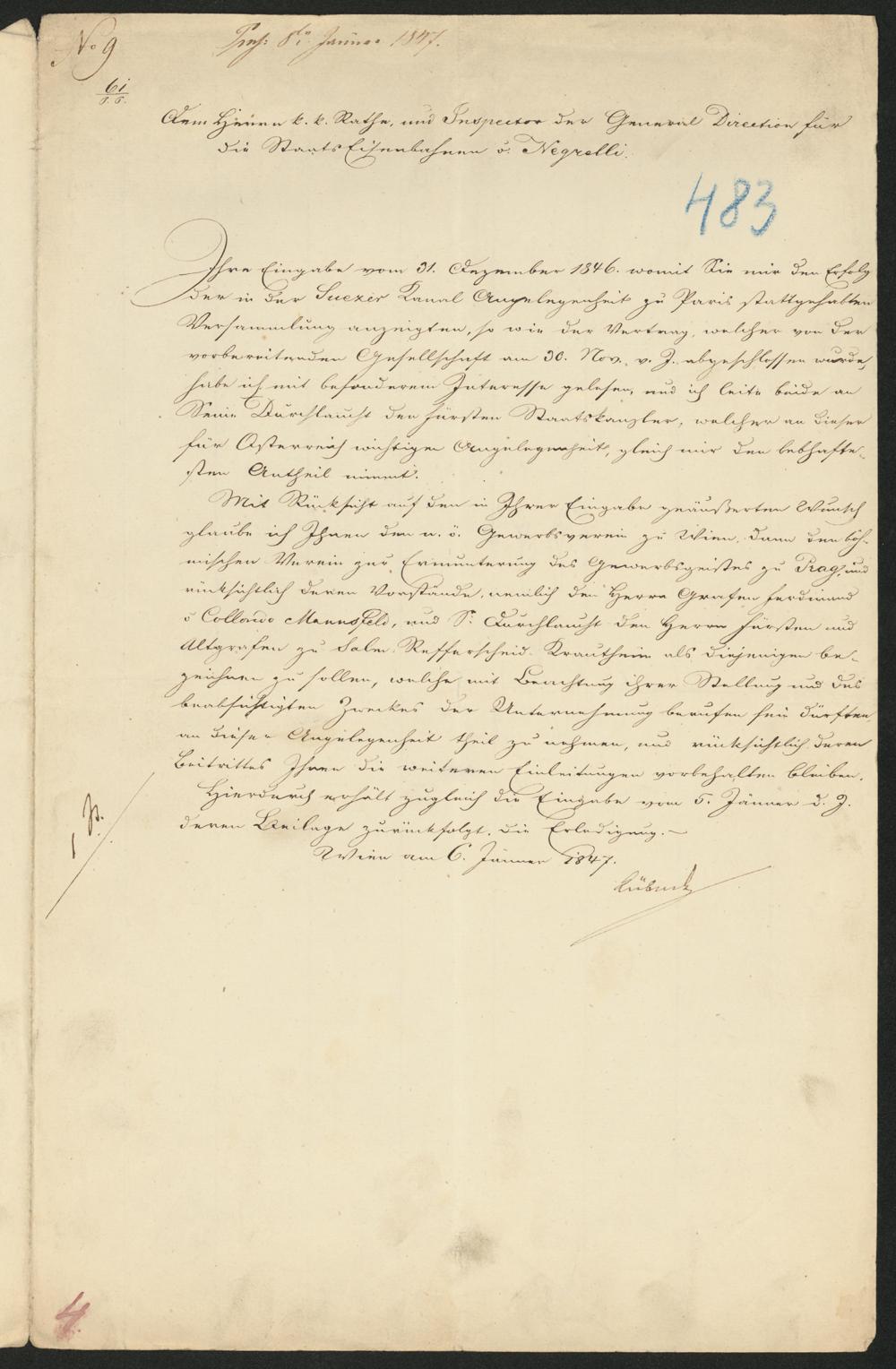 [Inf]: 8. Januar 1847.Dem Herrn k. k. Rathe, und Inspector der General Direction fürdie Staats Eisenbahnen v. NegrelliIhre Eingabe vom 31. Dezember 1846 womit Sie mir den Erfolgder in der Suezer Kanal Angelegenheit zu Paris stattgehabtenVersammlung anzeigten, so wie der Vertrag, welcher von dervorbereitenden Gesellschaft am 30. Nov. v. J. abgeschlossen wurde,habe ich mit besonderem Interesse gelesen, und ich leite beide anSeine Durchlaucht den Fürsten Staatskanzler, welcher an dieserfür Österreich wichtigen Angelegenheit, gleich nur den lebhafte-sten Antheil nimmt.