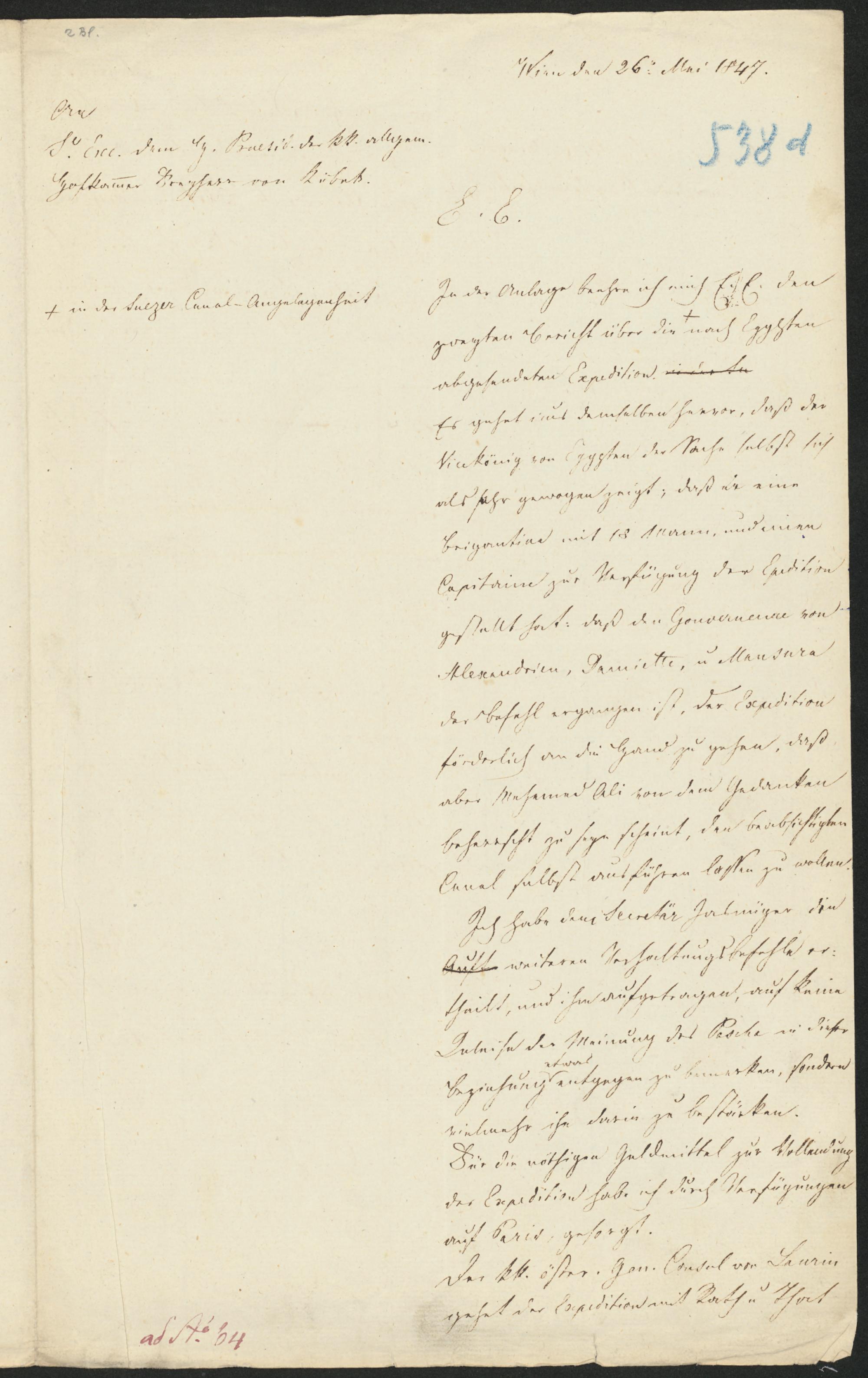 Wien den 26. Mai 1847.E. E.In der Anlage beehre ich mich E. E. denzweyten Bericht über die+ nach Egyptenabgesendeten Expedition.Es gehet aus demselben hervor, daß derVicekönig von Egypten der Sache selbst sichals sehr gewogen zeigt, daß er eineBrigantine mit 15 Mann, und einenCapitaine zur Verfügung der Expeditiongestellt hat: daß die Gouverneure vonAlexandrien, Damiette, u. Mansurader Befehl ergangen ist, der Expeditionförderlich an die Hand zu gehen, daßaber Mehemed Ali von dem Gedankenbeherrscht zu seyn scheint, den beabsichtigtenCanal selbst ausführen lassen zu wollen.Ich habe dem Secretär Jasnüger, dieweiteren Verhaltungsbefehle er-theilt, und ihm aufgetragen, auf keineWeise der Meinung des Pascha in dieserBeziehung etwas entgegen zu bemerken, sondernvielmehr ihn darin zu bestärken.Für die nöthigen Geldmittel zur Vollendungder Expedition habe ich durch Verfügungenauf Paris, gesorgt.Der kk. öster. Gen. Consul von Lauringehet der Expedition mit Rath u. That