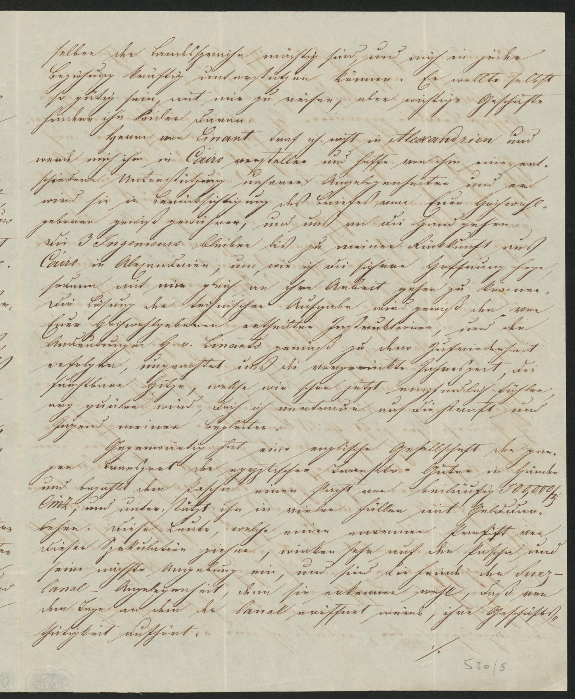 selben der Landessprache mächtig sind, und mich in jederBeziehung kräftig unterstützen können. Er wollte selbstso gütig sein, mit mir zu reisen, aber wichtige Geschäftehindern ihn leider daran.Herrn von Linant traf ich nicht in Alexandrien undwerde mich ihm in Cairo vorstellen und hoffe von ihm eine ent-schiedene Unterstützung unserer Angelegenheiten und erwird sie in Berücksichtigung des Briefes von Euer Hochwohl-geboren gewiß gewähren, und uns an die Hand gehen.Die 3 Ingenieurs bleiben bis zu meiner Rückkunft ausCairo in Alexandrien, um, wie ich die sichere Hoffnung hege,sodann mit mir gleich an ihre Arbeit gehen zu können.Die Lösung der technischen Aufgabe wird gewiß den vonEuer Hochwohlgeboren ertheilten Instruktionen, und den