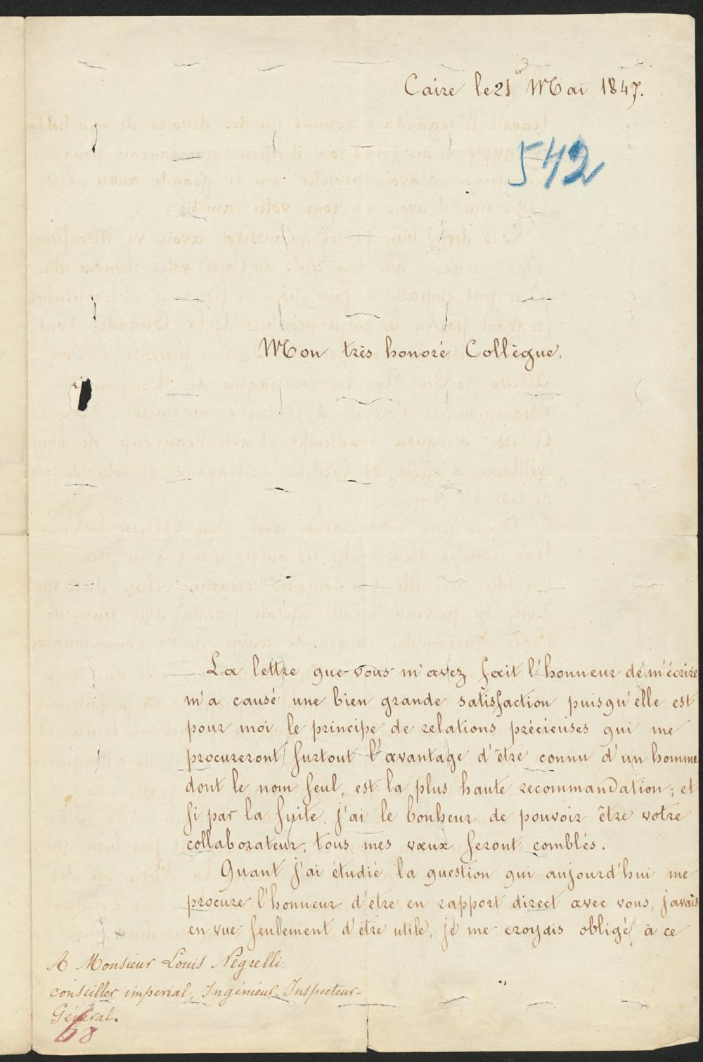 Caire le 21 mai 1847.Mon très honoré Collègue,La lettre que vous m'avez fait l'honneur de m'écrirem’a causé une bien grande satisfaction puis qu'elle estpour moi le principe de relations précieuses qui meprocureront surtout l'avantage d'être connu d'un hommedont le nom seul, est la plus haute recommandation; etsi par la suite, j'ai le bonheur de pouvoir être votrecollaborateur, tous mes vœux seront comblés.Quant j'ai étudié la question qui aujourd'hui meprocure l'honneur d’être en rapport direct avec vous, j'avaisen vue seulement d'être utile, je me croyais obligé à ceA Monsieur Louis Negrelli,conseiller imperial, Ingenieur Inspecteur Géneral.