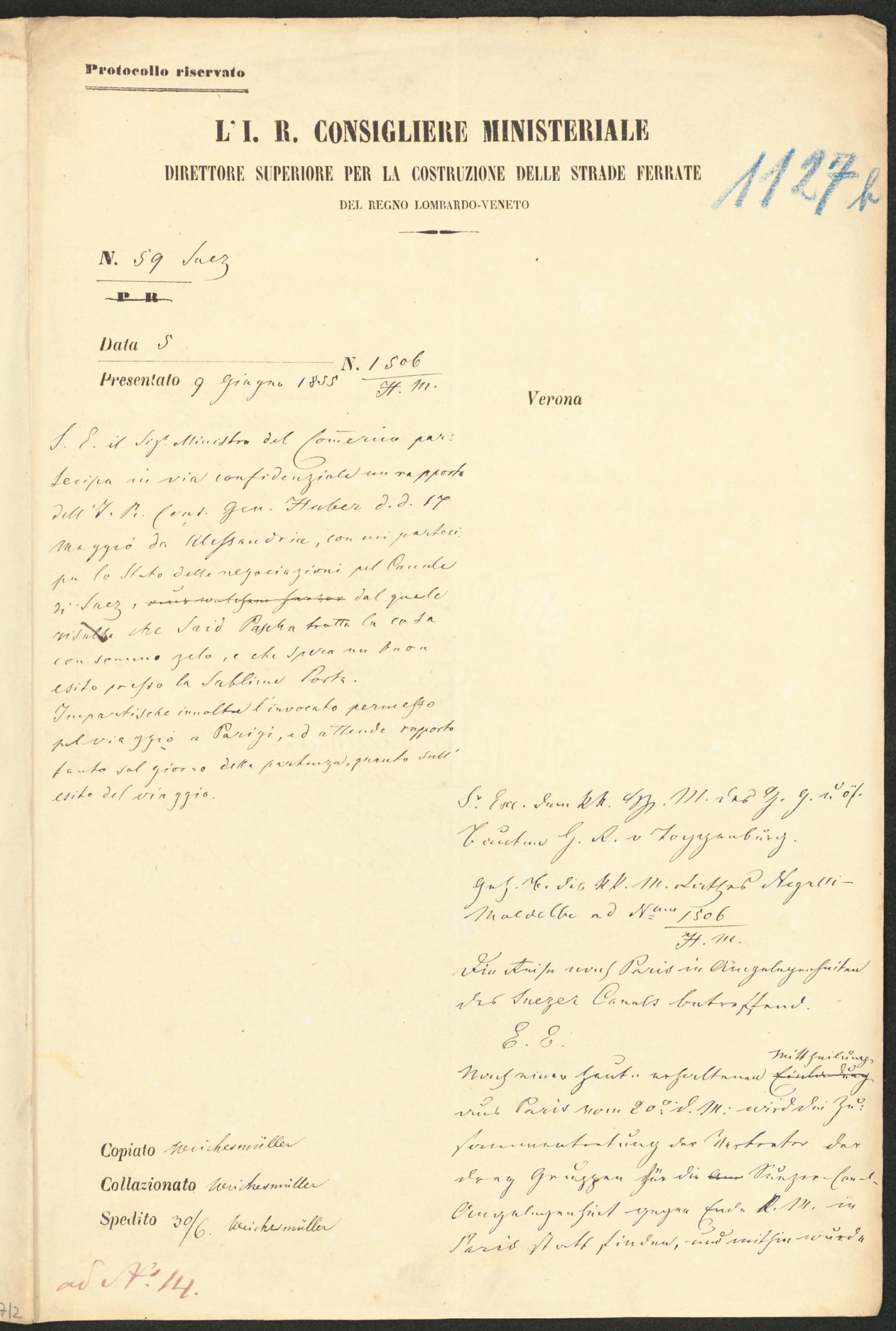 Protocollo riservato L'I. R. CONSIGLIERE MINISTERIALE DIRETTORE SUPERIORE PER LA COSTRUZIONE DELLE STRADE FERRATEDEL REGNO LOMBARDO-VENETOPresentato 9 Giugno 1855VeronaS. E. il Sig. Ministro del Commercio par-tecipa in via confidenziale un rapportodell I. S. Cons. Gen. Huber d. d. 17.Maggio da Alessandria, con mi parteci- pa lo Stato delle negaciazioni il Canaledi Suez, aus welchem hervor dal qualerisulte che Said Pascha tratte la cosa con somme zelo, e che spera na [unleserlich]esito presso la Sublime Porta.Impartische inalte l'invocato permessopel viaggio a Parigi, ed attende rapportotanto dal giorno delle partenza, quanto dall'esito del viaggio.Sr. Exc. dem k. k. M. des H. G. u. ös.Bauten G. R. v. Toggenburg.Ges. B. die k. k. M. Rathes Negrelli-¬Moldelbe ad Num. 1506H. M.Die Reise nach Paris in Angelegenheitendes Suezer Canals betreffend.E. E.Nach einer heute erhaltenen Mittheilungaus Paris vom 20. d. M. wird die Zu-sammentretung der Vertreter derdrey Gruppen für die am Suezer-CanalAngelegenheit gegen Ende d. M. inParis statt finden, und mithin wurdeCopiato WeichermüllerCollazionata WeichermüllerSpedito 30/6 Weichermüller